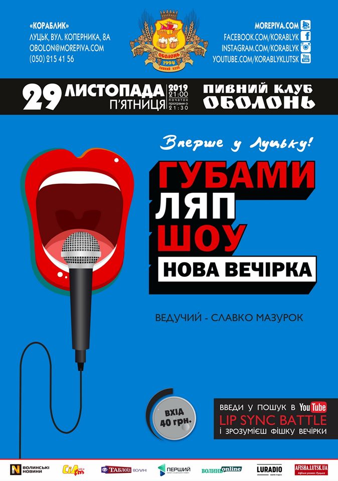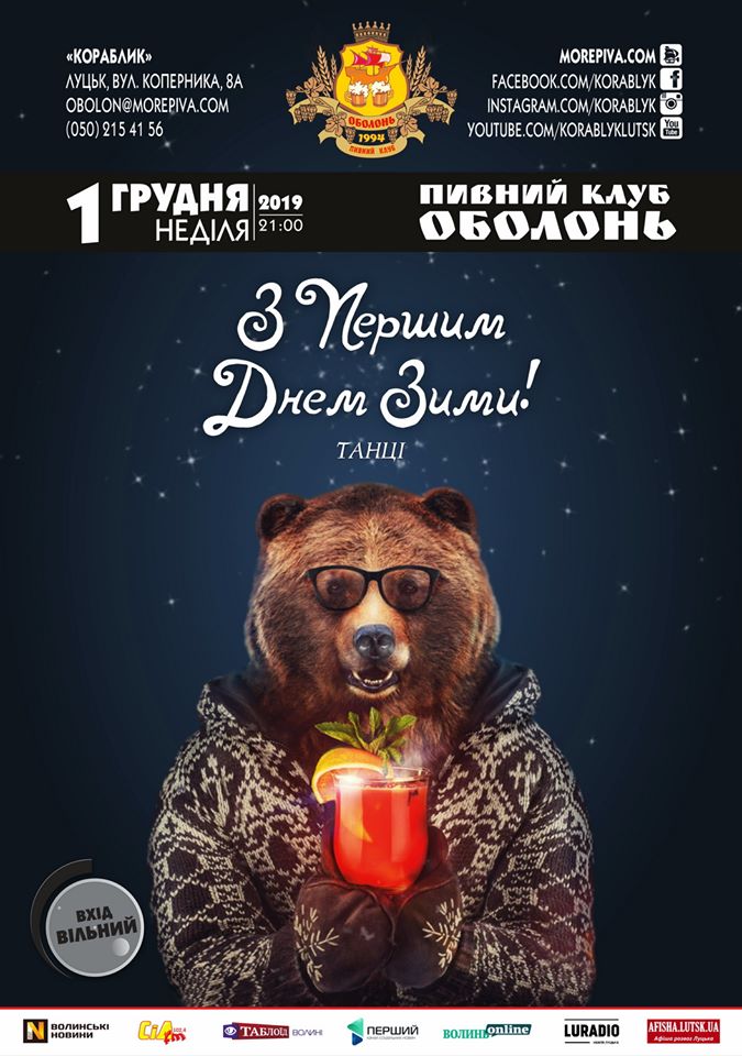 Забава «ГУБАМИ ЛЯП ШОУ». Ведучий Славко Мазурок у пивному клубі “Оболонь” | 29 листопадаВистава “Обережно - жінки” у Волинському драмтеатрі імені Тараса Шевченка | 29 листопадаWest Media Forum: Брендам потрібні медіа в Адреналін Сіті | 29 листопадаJazzforacat у Волинському театрі ляльок | 29 листопадаДискотівка 90-х у пивному клубі “Оболонь” | 30 листопадаВистава “Химерна Мессаліна” у Волинському драмтеатрі імені Тараса Шевченка | 30 листопадаIз Першим Днем Зими! Танцi в пивному клубі “Оболонь” | 1 грудняСвятослав Кондратив #турВиКинг у Палаці культури міста Луцька | 1 грудняВистава “Лисиця, що впала з неба” у Волинському театрі ляльок | 1 грудняХіп-хоп гурт із Харківщини «Курган і Agregat» у арт-кафе «Стоп-кадрі» | 1 грудняЦирк «Олімп» біля Там-Таму | 1 грудняВистава “Циганка Аза” у Волинському драмтеатрі імені Тараса Шевченка | 1 грудняПоказ стрічки “Chrzest/Хрещення” у Multiplex | 2 грудняОксана Білозір у Волинському драмтеатрі імені Тараса Шевченка | 3 грудня