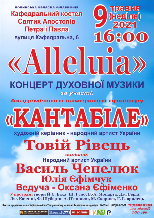 Костюмована вечірня екскурсія з каганцями «Скарби музею» у Волинському краєзнавчому музеї | 29 квітня«Геноцид ромів на Волині: події та пам’ять про них на узбіччі «великих історій». Онлайн-лекція Михайла Тяглого | 29 квітняОнлайн-гра «Ліла» від Центру життєвої сили | 2 травняЕтнофестиваль «Великдень у Луцьку» | 3 травняVivienne Mort у Волинському академічному обласному музично-драматичному театрі імені Тараса Шевченка | 4 травня«Нобелівські лауреати: Альберт Камю». Онлайн-лекція від Євгенія Стасіневича | 4 травняКіноквіз від Wait For It у «Карабасі Барабасі» | 5 травняОнлайн-лекція Ярослава Грицака «Пандемія, рік перший. Перші висновки» | 6 травняВистава «Монодії в червоному» в Гармидер ангар-stage | 8 травняКонцерт духовної музики в костелі Святих Апостолів Петра і Павла | 9 травня