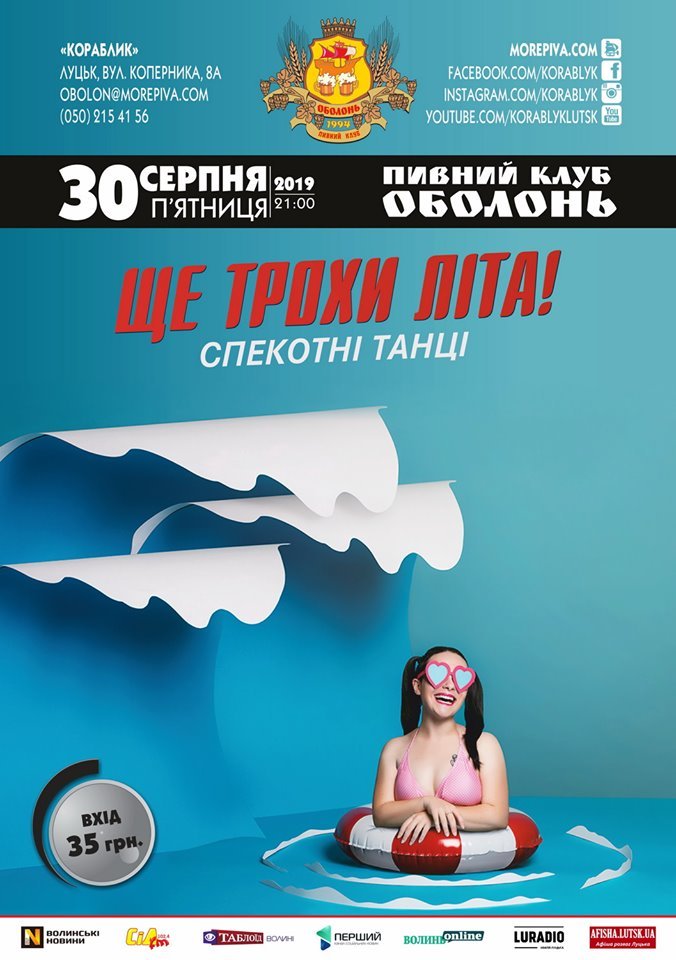 Навчання з написання проєктних заявок у Центрі національно-патріотичного виховання | 30 серпняЩе трохи лiта! Танцi в пивному клубі «Оболонь» | 30 серпняМіжнародний джазовий фестиваль Art Jazz 2019 у Луцькому замку | 30–31 серпняКавьор-паті. Вечір кантрі в пабі «Oldskull» | 31 серпняВиставка картин Миколи Ампілогова New WAY у РЦ «Промінь» | 31 серпняТiльки Хiти. Танцi в пивному клубі «Оболонь» | 31 серпняКубок України зі середньовічного бою «Середньовічний Лучеськ. Доблесть віків» у замку Любарта | 31 серпня – 1 вересняГурт «OUTCRY» у пивному клубі «Оболонь» | 1 вересняЛекція «Чому комунікації важливі?» у Молодіжному центрі Волині | 4 вересня