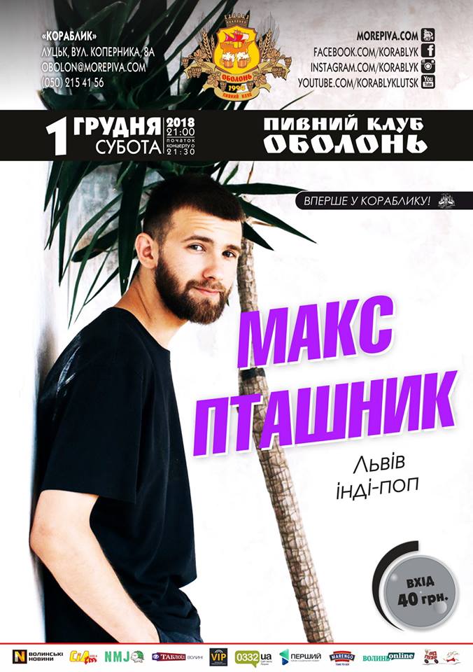 Виступ гурту KARNA в арт-кафе «Стоп-Кадр» | 30 листопадаЛише вершки: 1990-2018. Танці в пивному клубі «Оболонь» | 30 листопадаЮвілейний концерт Хору імені Григорія Верьовки на честь 75-річчя у Волинському академічному обласному музично-драматичному театрі імені Тараса Шевченка | 30 листопадаДискотека 1410. Майстер-класіз середньовічних танців у Молодіжному клубі Волині | 1 грудняКонцерт Макса Пташника в пивному клубі «Оболонь» | 1 грудняКонцерт львів’янки Олени Мацелюх у Кафедральному костелі Святих Апостолів Петра і Павла | 2 грудняКонцерт гурту Space Of Variations у пивному клубі «Майдан» | 2 грудняВистава «Чарівна лампа Аладдіна» у Волинському академічному обласному музично-драматичному театрі імені Тараса Шевченка | 2 грудня«Фанотека. Те, що ви любите». Танці в пивному клубі «Оболонь» | 2 грудняВистава «Наталка Полтавка» у Волинському академічному обласному музично-драматичному театрі імені Тараса Шевченка | 2 грудняКонцерт грузинського ансамблю «Горі» у Волинському академічному обласному музично-драматичному театрі імені Тараса Шевченка | 3 грудняКонцерт Ірини Федишин у Волинському академічному обласному музично-драматичному театрі імені Тараса Шевченка | 4 грудняВечір із Анатолієм Вітинським у пивному клубі «Майдан» | 4 грудняМіжнародний ІТ-форум Bit-2018 у Passage Interdit | 5 грудняПрезентація книги Сергія Мартинюка «Капітан Смуток» у книгарні «Є» | 5 грудняАкустичний вечір Юрія та Андрія Поліщуків у пивному клубі «Майдан» | 5 грудняТренінг «Соціальні мережі для бізнесу» в бізнес-центрі «Директорія» | 6 грудняВечір рок балад та хітів блюзу в пивному клубі «Майдан» | 6 грудняВистава «Обережно – жінки» у Волинському академічному обласному музично-драматичному театрі імені Тараса Шевченка | 6 грудня