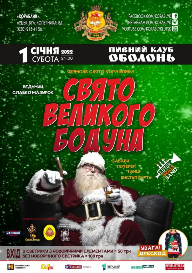 «Свято великого бодуна» в пивному клубі «Оболонь» | 1 січняНоворічна караоке-дискотека в Boremel Hills | 1 січняМузична комедія на дві дії «Різдвяна ніч» у Волинському академічному музично-драматичному театрі імені Тараса Шевченка | 2, 7 січняВистава «Лускунчик» у Волинському академічному обласному театрі ляльок | 2 січня«Дисколихоманка 70-80-90-х» у пивному клубі «Оболонь» | 2 січняВистава «Веселий маскарад» у Волинському академічному обласному театрі ляльок | 3 січня«Різдвяні гоцалки» в пивному клубі «Оболонь» | 7 січняРіздвяний концерт у Волинському академічному музично-драматичному театрі імені Тараса Шевченка | 8, 9 січняМузична казка на дві дії «Бременські музиканти» у Волинському академічному музично-драматичному театрі імені Тараса Шевченка | 9 січняФестиваль вертепів «З Різдвом Христовим!» у Палаці культури міста | 9 січня