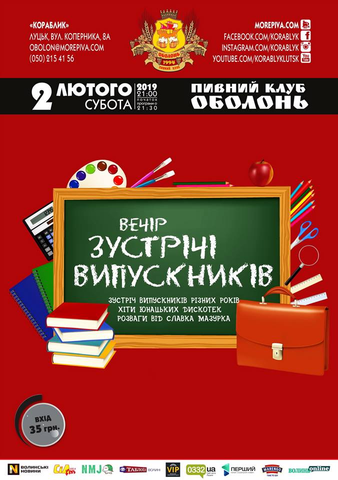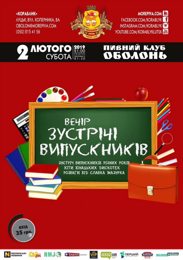 Шоу «Твоя тінь» від театру тіней Teulis у Волинському обласному академічному музично-драматичному театрі імені Тараса Шевченка | 31 січняВечір рок-балад та хітів блюзу в пивному клубі «Майдан» | 31 січняВиставка картин відомих художників Волині в РЦ «Промінь» | 1 лютогоГоцалки в пивному клубі «Оболонь» | 1 лютогоЛекція «Історія перформансу» в Музеї сучасного українського мистецтва Корсаків | 2 лютогоВечір зустрічі випускників! Вечірка в пивному клубі «Оболонь» | 2 лютогоБлагодійний концерт гурту «Лісапетний батальйон» у Волинському обласному академічному музично-драматичному театрі імені Тараса Шевченка | 2 лютогоКонцерт Юлії Іванової та гурту «Freedom» у пивному клубі «Майдан» | 2 лютогоСерія майстер-класів з олійного живопису в Музеї сучасного українського мистецтва Корсаків | 2 лютогоДень зустрічі випускників у Ring DJ Cafe | 2 лютого«Монодіалоги» від театру-студії «Гармидер» у Луцькому районному будинку культури | 3 лютогоРадіоХіти. Танці в пивному клубі «Оболонь» | 3 лютогоВистава «Сонечко і снігові чоловічки» у Волинському академічному обласному театрі ляльок | 3 лютогоВиставка «Будуть приходити люди…» у Волинському краєзнавчому музеї | 4 лютогоЛекція «Як поводити себе з поліцією?» в Молодіжному центрі Волині | 5 лютогоКонцерт хітів Андрія Кузьменка «Шампанські очі» у виконанніестрадно-симфонічного оркестру у Волинському обласному академічному музично-драматичному театрі імені Тараса Шевченка | 7 лютого