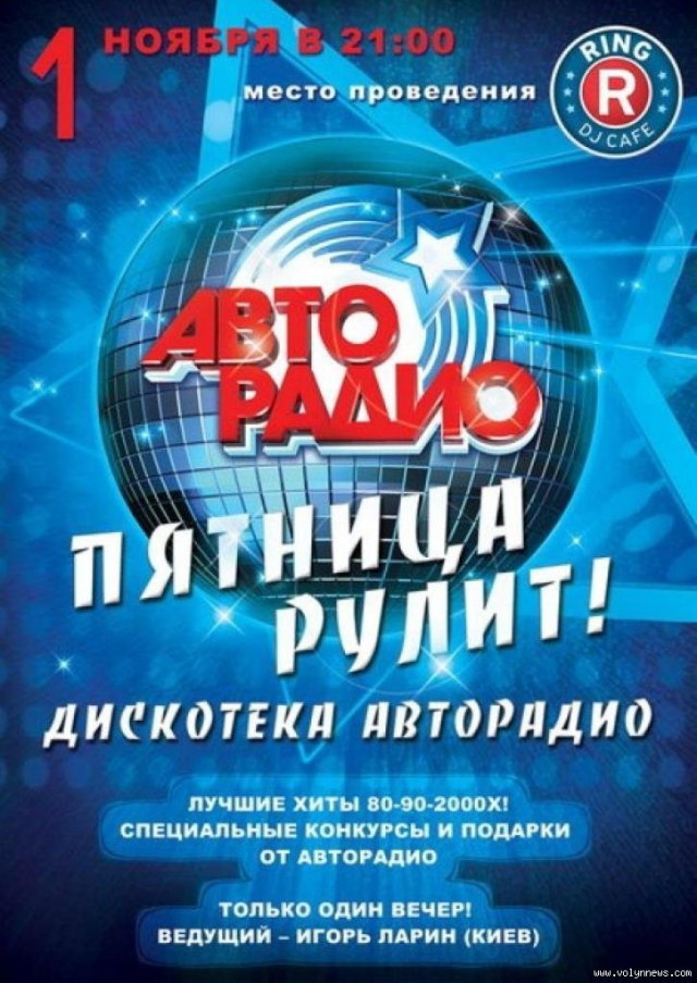 Вечірка від легендарного «АВТОРАДІО». Найкращі хіти 1980-2000 років, та подарунки гостям. Ведучий - Ігор Ларін (м. Київ).