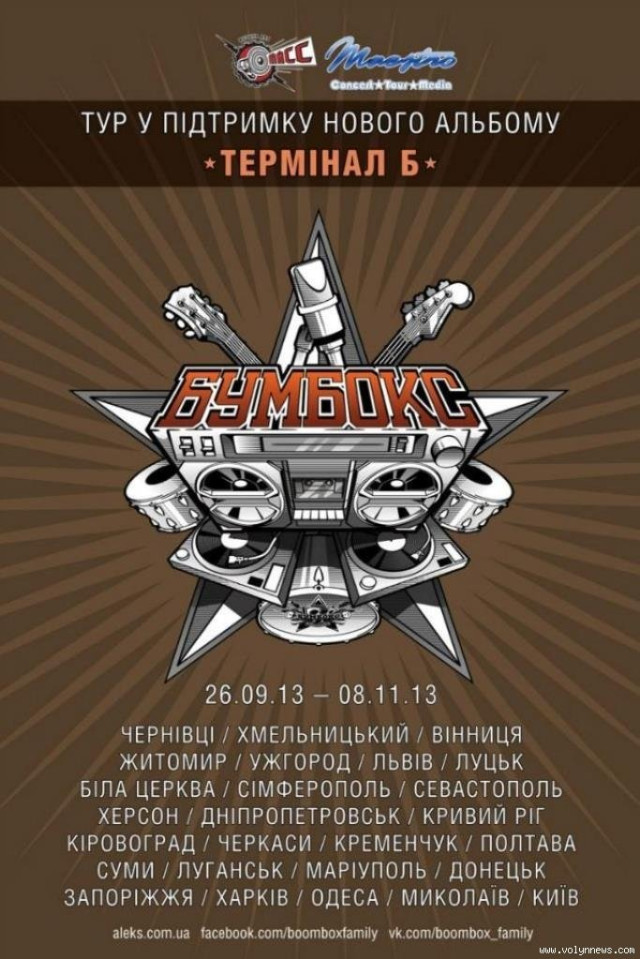Живий виступ гурту «Бумбокс»! Хлопці представлять новий альбом Терміналі «Б», а також зіграють старих відомих хітів. Ціни на квитки від 120 до 300 гривень.