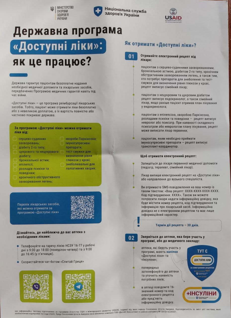 Щоб отримати ліки необхідно звернутися до однієї з аптек, яка бере участь у державній програмі реімбурсації. Уci аптеки, які приєдналися до програми, мають наліпку «Доступні ліки» або «Інсуліни».
