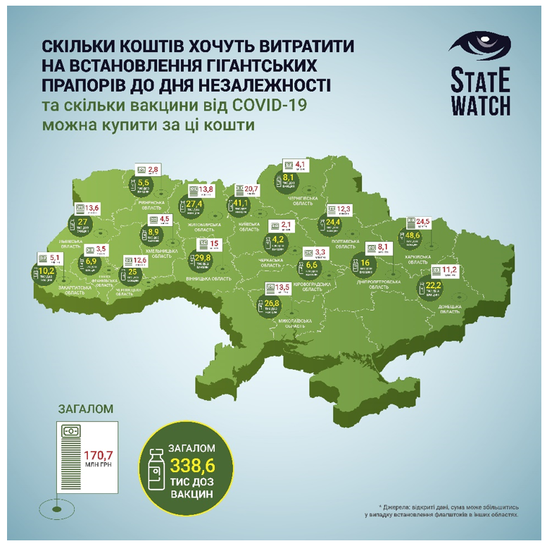 За словами Істрєбіна, у цій віковій групі, ризик госпіталізації при зараженні найвищий, і становить 51%, ризик летального результату 17%.За даними ourworldindata.org, за темпами вакцинації Україна дуже відстає не те що від європейських, а й від перерахованих вище країн.Між тим, українська влада готується до пафосного відзначення Дня Незалежності. Нагадаємо, у січні цього року на селекторній нараді в Офісі президента під головуванням Кирила Тимошенка кожній ОДА було доручено забезпечити встановлення найбільшого державного прапора України в області до Дня Державного Прапора з нагоди 30-річчя незалежності держави. StateWatch із посиланням на облдержадміністрації та інформацію з відкритих джерел, загальна вартість реалізації такого проекту становитиме 170,7 млн грн. Експерти організації підрахували, що за ці гроші Україна могла б придбати понад 338 тис. доз вакцини.