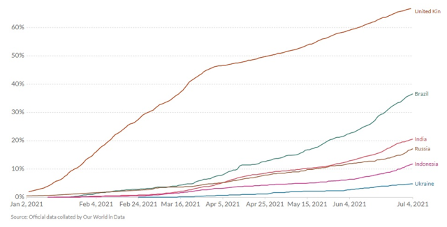 На минулому тижні добовий показник захворюваності у Великій Британії перевищив 25 тис. Водночас уряд на Туманному Альбіоні не вішає носа і планує зняти обмеження 19 липня. Передумови для оптимізму є: високий рівень охоплення вакцинацією та високий рівень тестування.