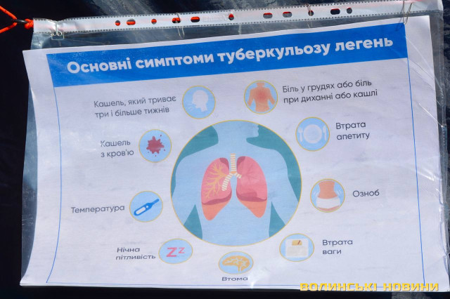 Протягом дня на Театральному майдані в Луцьку можна пройти обстеження, зокрема зробити флюорографію та більше довідатися про симптоми, лікування й профілактику туберкульозу.