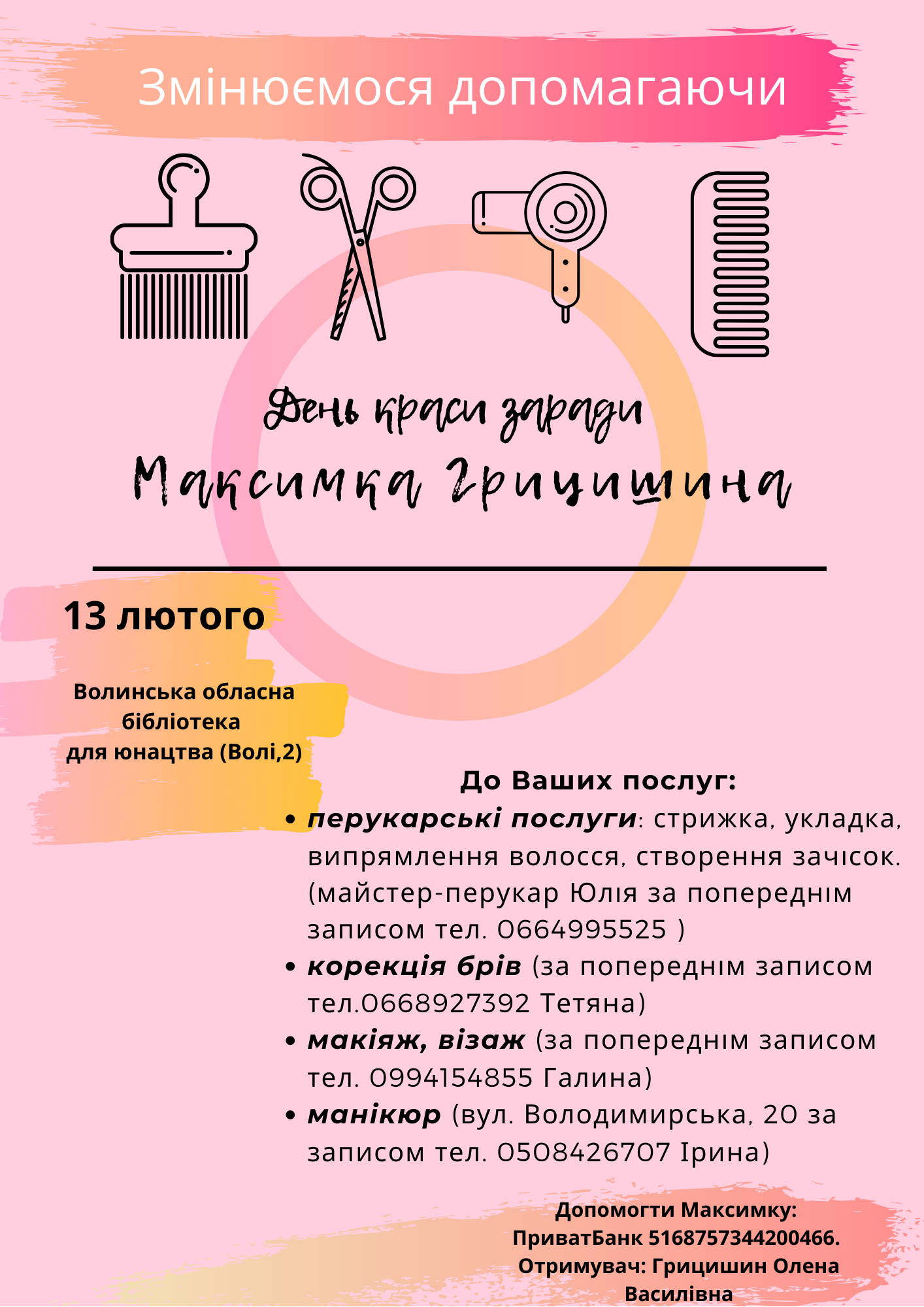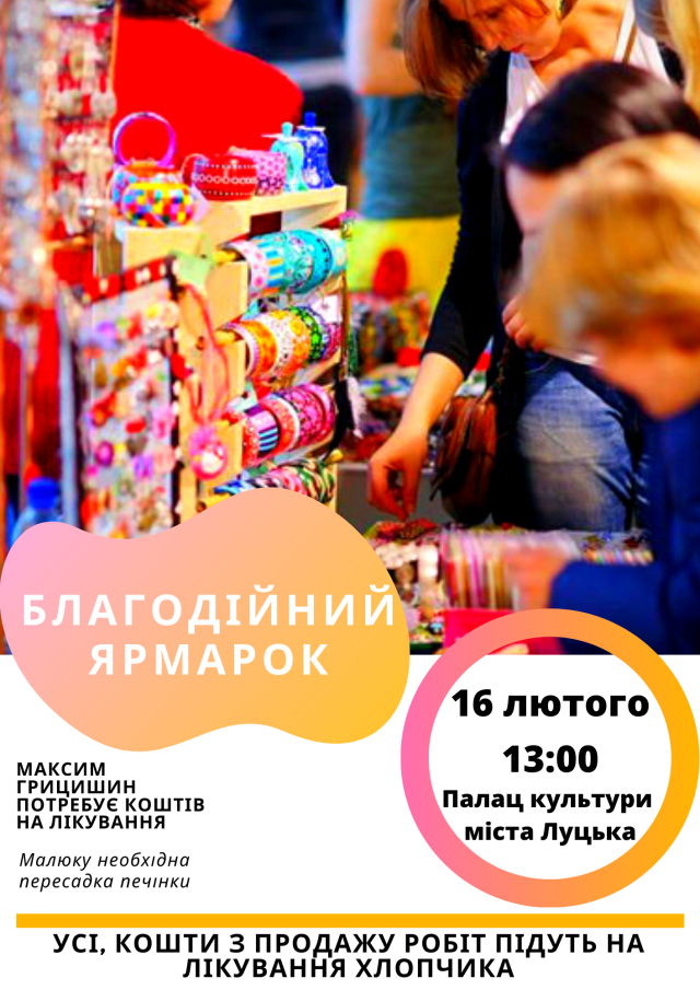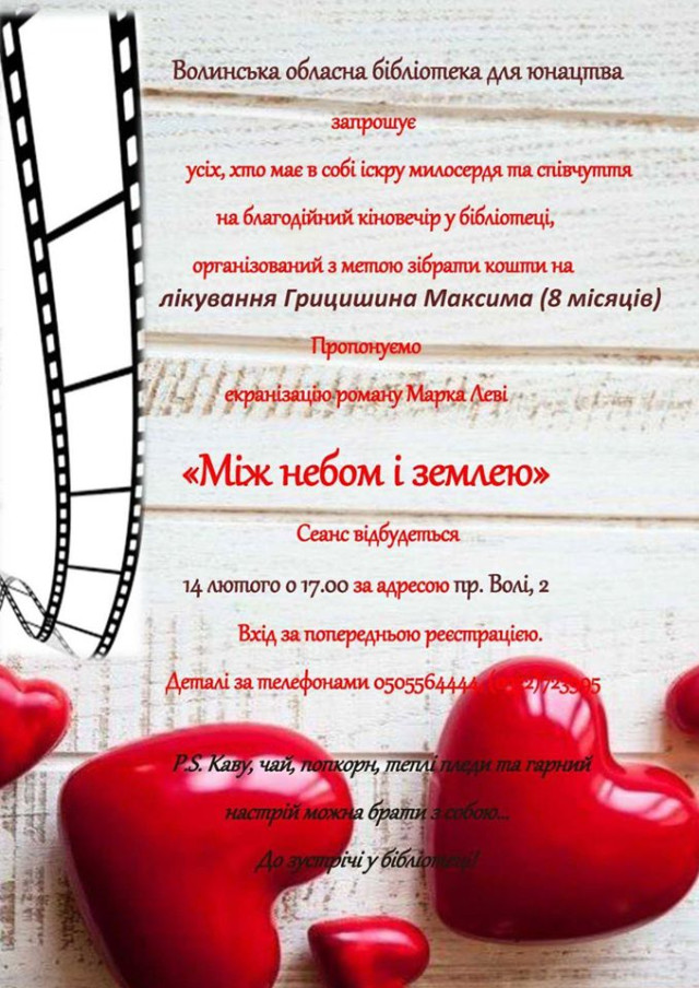 Так, 13 лютого, напередодні Дня закоханих в обласній бібліотеці для юнацтва проведуть день краси. Жінки можуть оновити свої зачіски, дізнатися чимало цікавого про догляд, поправити брови, або ж зробити манікюр. Кошти, підуть на допомогу Максимку, однак варто попередньо зареєструватися у майстра.Також в бібліотеці 14 лютого відбудеться благодійний перегляд кінофільму «Між небом та землею» (екранізація роману Марка Леві). Початок сеансу о 17 годині, з собою закликають взяти пледики, смаколики та чай.Уже 16 лютого в Палаці культури міста Луцька з 13 години стартує благодійний ярмарок. До того, майстрів просять подарувати свої роботи для доброї справи, аби можна було їх продати й допомогти маленькому волинянину. Роботи можна залишити в тій же юнацькій бібліотеці. Під час ярмарку продаватимуть чимало прикрас, виробів ручної роботи та кондитерських виробів. Тож можна купити щось на пам'ять, поласувати солодощами та допомогти Максимку Грицишину.Також можна допомогти перерахувавши будь-яку суму батькам, адже навіть маленький внесок наближає їх до мети.