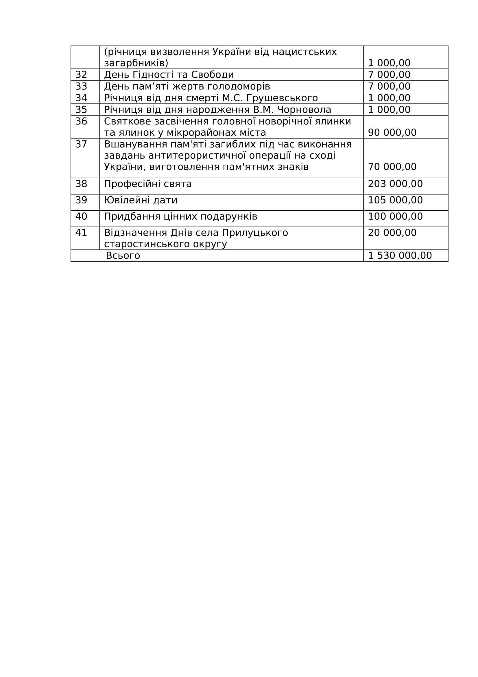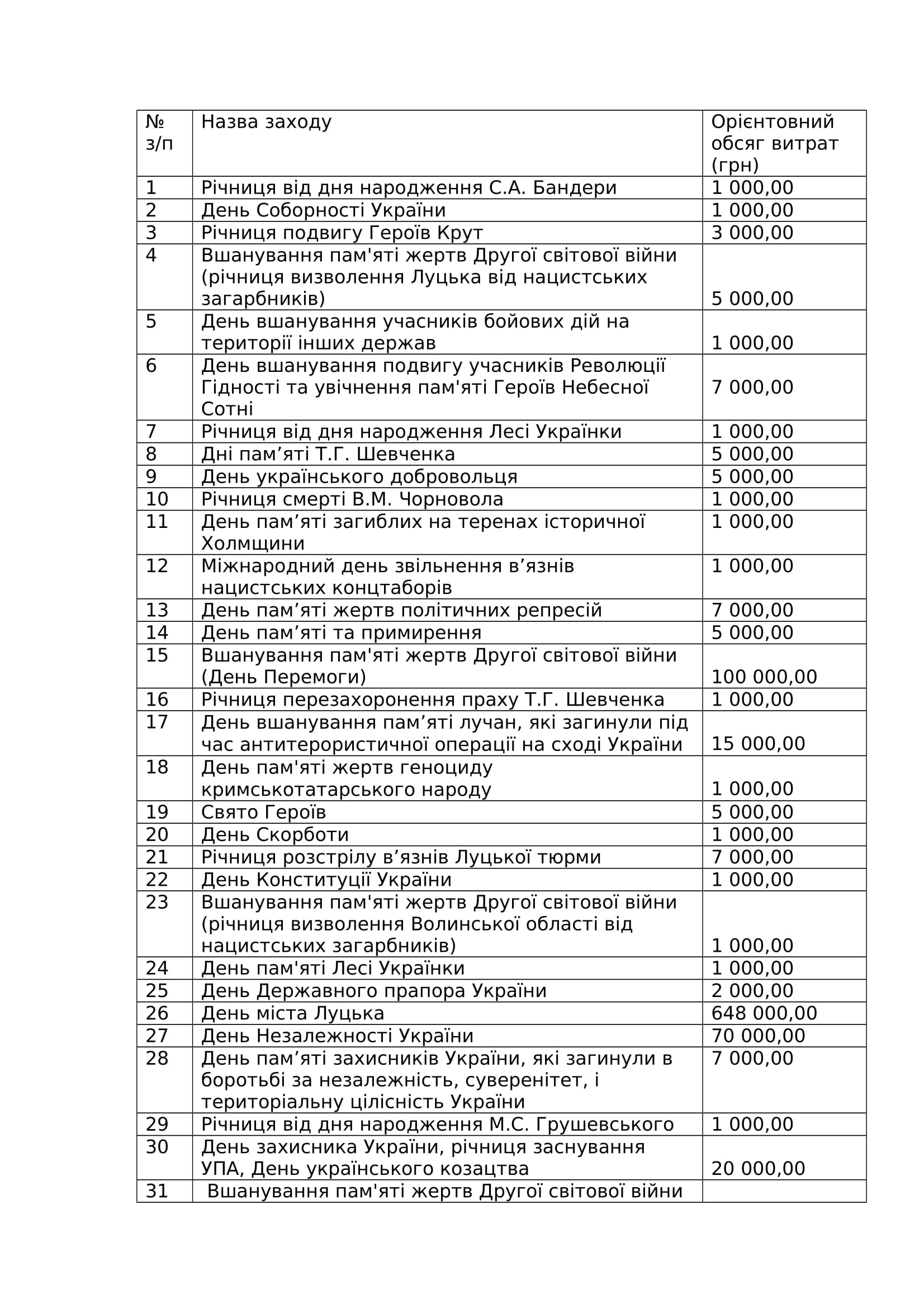 Ще 70 тисяч гривень планують спрямувати на святкування Дня незалежності України, 100 тисяч гривень – на вшанування пам'яті жертв Другої світової війни, 20 тисяч гривень – на День захисника України, річницю заснування УПА та День українського козацтва, 203 тис. – на відзначення професійних свят, 105 тис. грн – на ювілейні дати, 100 тис. – на придбання цінних подарунків.