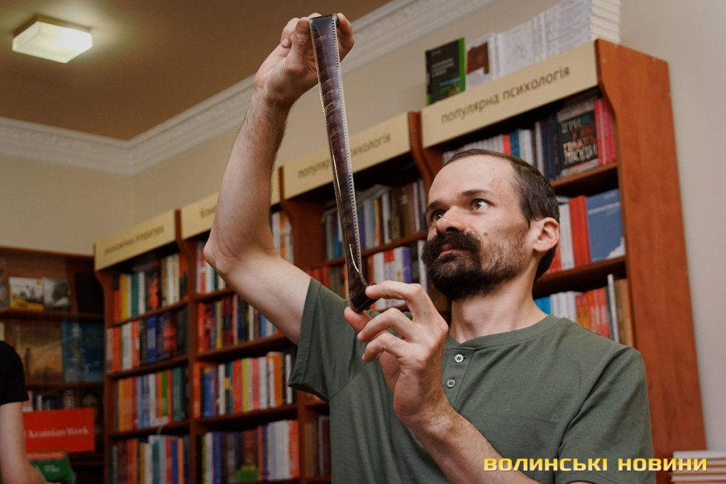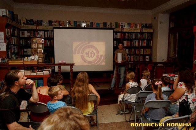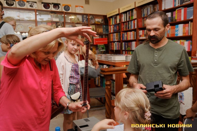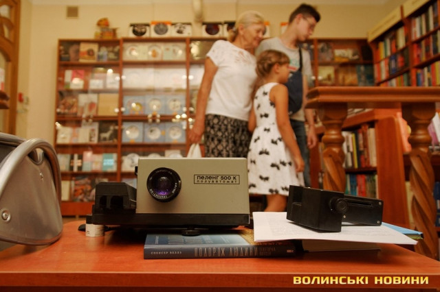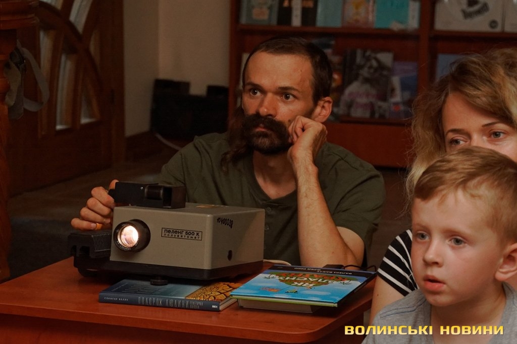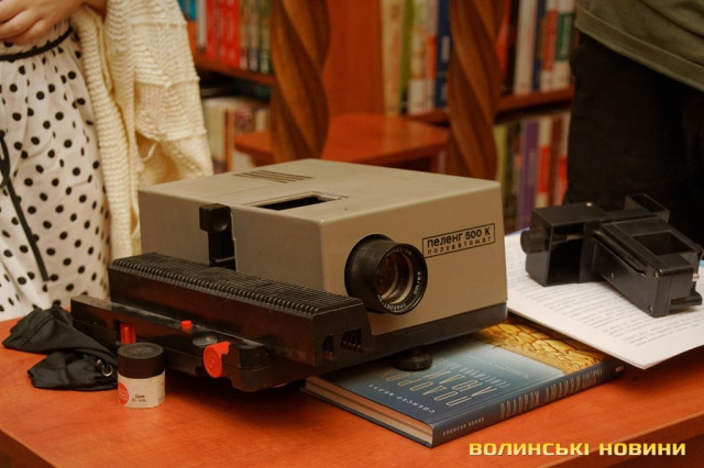 Пощастило і з робочим проектором, необхідним для перегляду раритетної стрічки. У цьому Ірині допоміг вже традиційний асистент – Андрій Бондарук. Сьогодні художнику довелося попрацювати кіномеханіком – налагоджувати техніку та прокручувати плівку. Зрозуміло, що картинки на слайдах підписано російською. Вихід з цієї ситуації також знайшли – художниця читала адаптований текст нашою рідною мовою. Відзначимо, це лише підсилило атмосферу заходу, відтворюючи той час, коли стрічки були «німими».