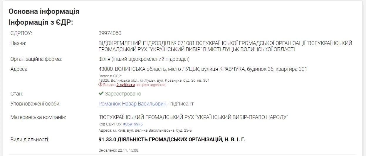 Згідно з даними реєстрів, Романюк Н.В. очолював відокремлений підрозділ №071081 Всеукраїнської громадської організації «Всеукраїнський громадський рух «Український вибір» у м. Луцьк Волинської області».