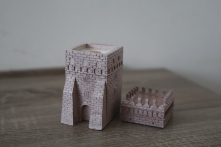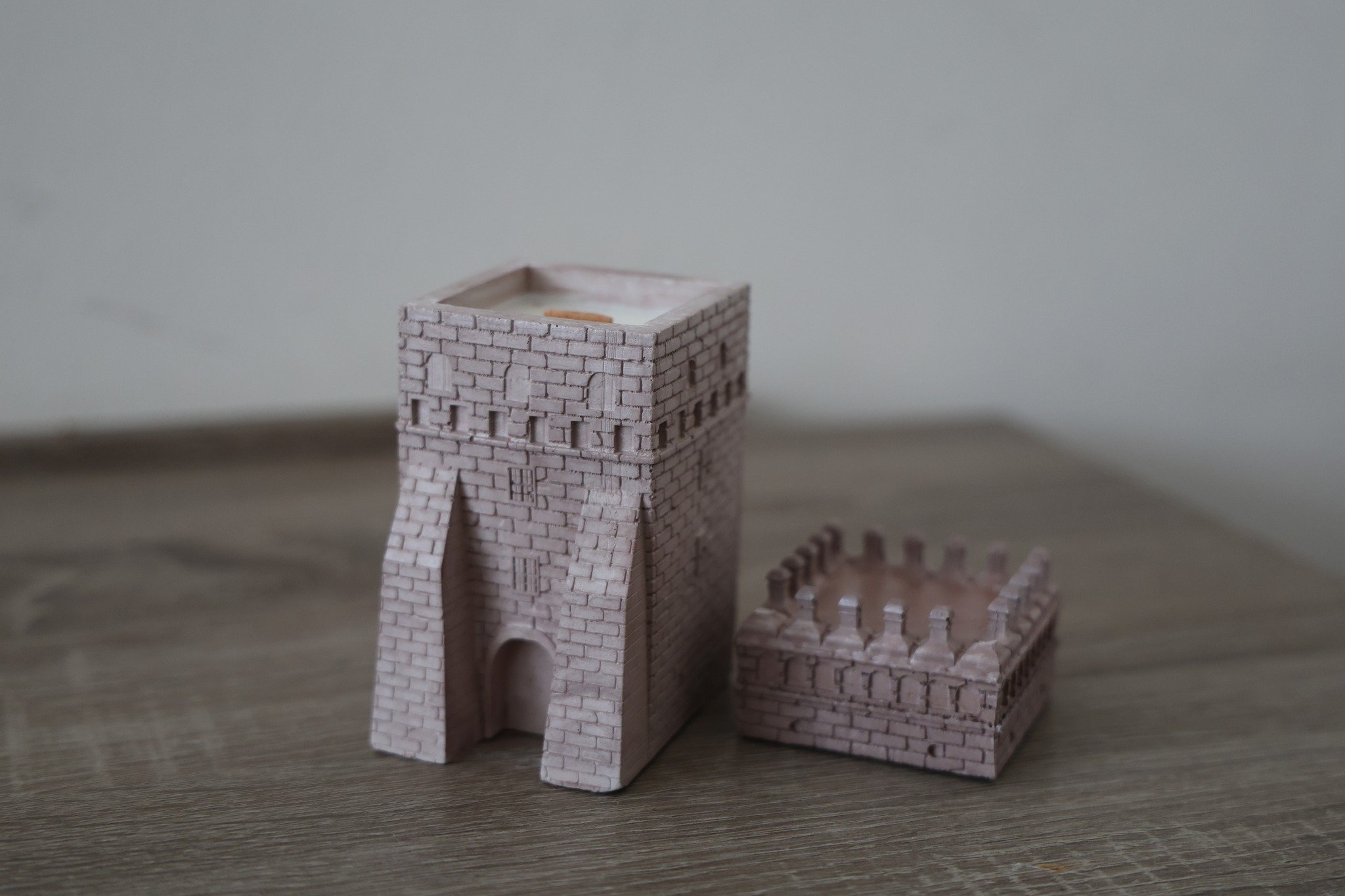 Ці свічки за 550 гривень за одиницю виготовляє знана майстриня, дружина військового, який захищає Україну, Ірина Туревич. Це подарунковий набір, який складається з власне ароматизованої свічки в гіпсовій скульптурі, виконаній у формі в’їзної вежі Луцького замку, та пакування.
