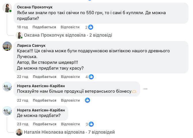 У коментарях до допису лучани відзначили красу та оригінальність виробу, дехто захотів придбати його собі.«Свідомого» депутата Андрія Лучика обурило, що міськрада вирішила купити сувенірні свічки в дружини військового. Мовляв, в інтернеті можна знайти й дешевші аромасвічки. Хоча як приклад навів свічки масового виробництва, зокрема з мережі «Аврора». В той час як майстриня робить їх власноруч, в оригінальному дизайні у формі Луцького замку. Андрій Лучик розкритикував також те, що Ірина Туревич зареєструвалася підприємицею лише у квітні 2024 року.