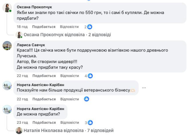 Вона наголосила, що в цьому випадку 55 тисяч гривень за 100 свічок в кашпо у формі Луцького замку – це не просто цифри, а підтримка родини ветерана, яка будує власний бізнес під час війни.