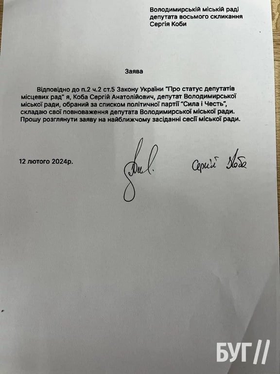 Заяву, датовану 12 лютого, Сергій Коба надіслав електронним листом на пошту Володимирської міської ради. У ній він виявив намір скласти повноваження депутата Володимирської міської ради, обраним за списком політичної партії «Сила і Честь».