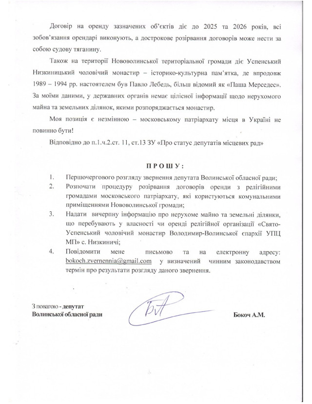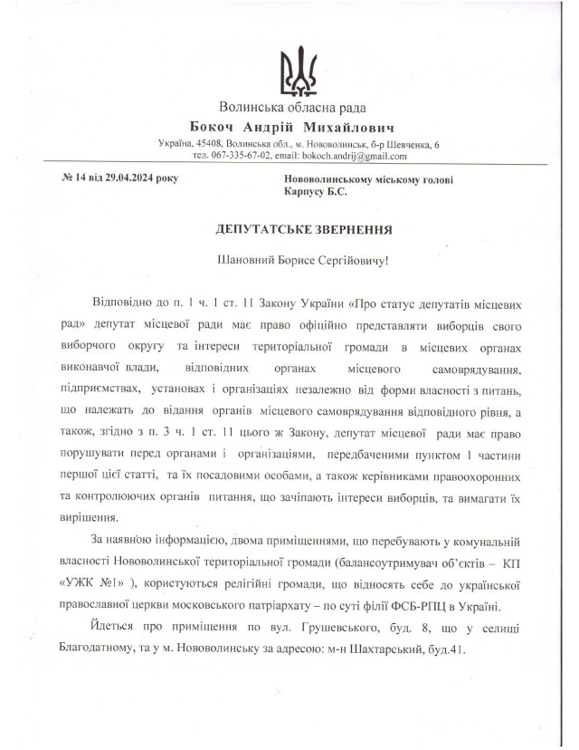 Депутат Волинської обласної ради Андрій Бокоч закликав мера Нововолинська Бориса Карпуса розірвати договори оренди з релігійними громадами московського патріархату, які мають у користуванні комунальні приміщення.