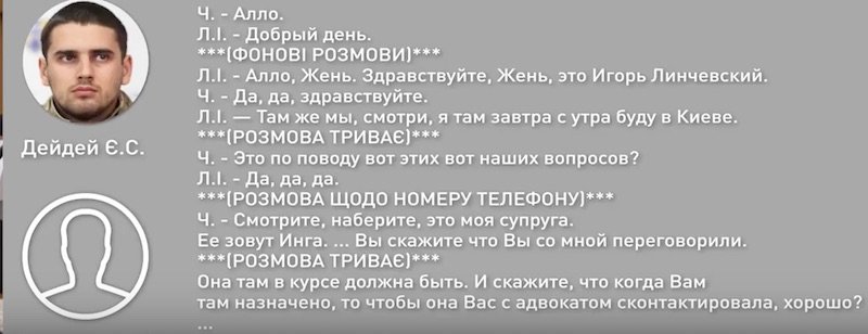 Нижче наводиться фрагмент тексту прослуханого розмови підприємця Личевського з депутатом від Народного фронту Євгеном Дейдеем, фігурантом справи про незаконне збагачення.