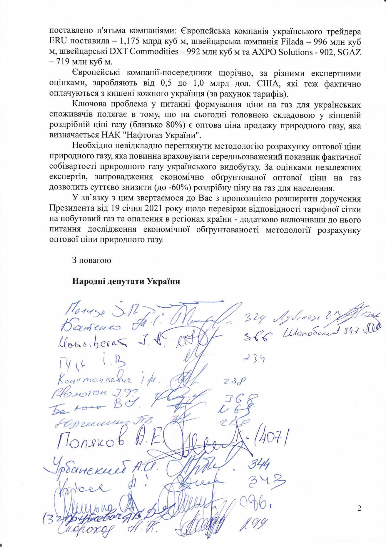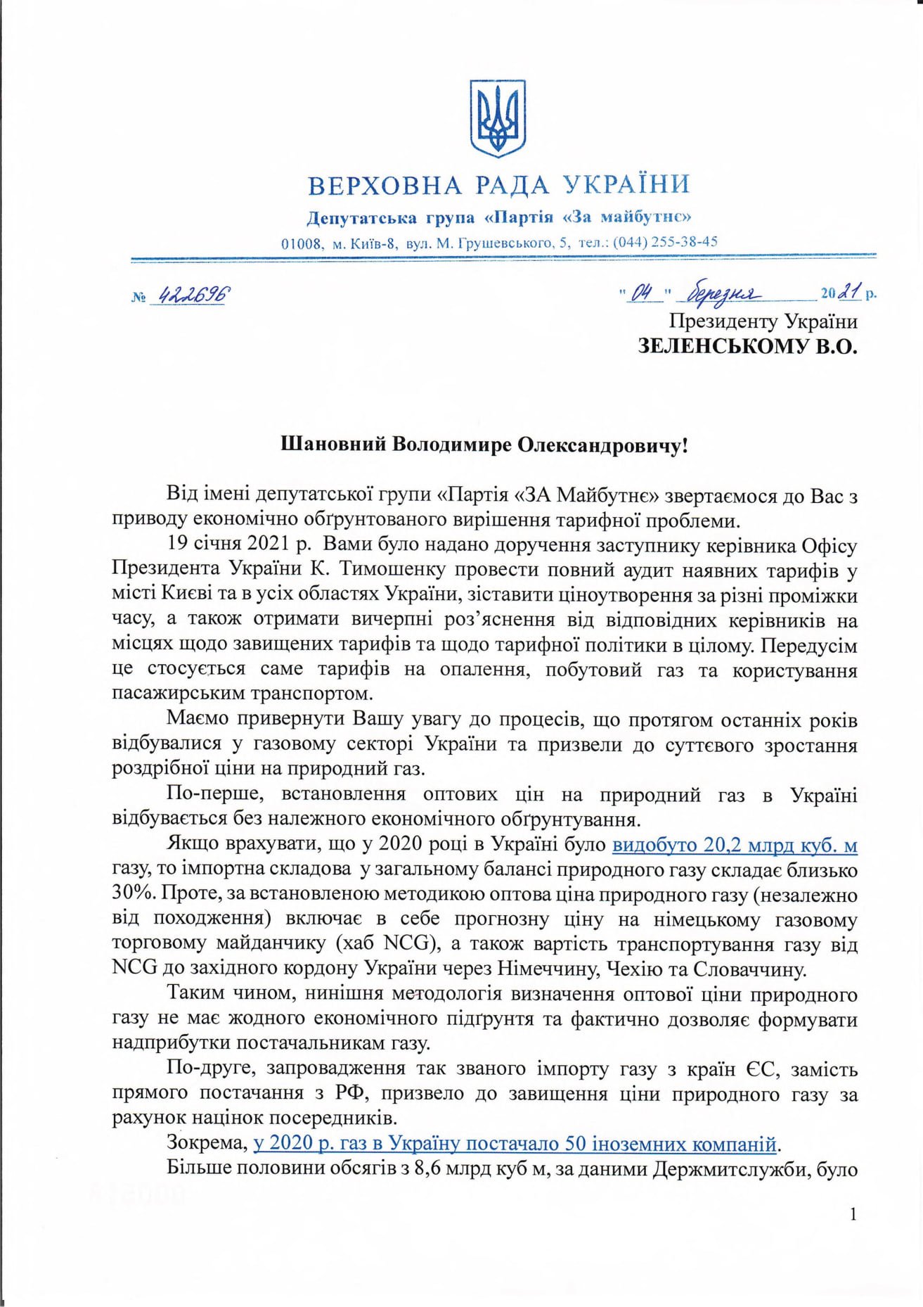 За його словами, для перегляду тарифу "Нафтогазу" депутатська група "Партія "ЗА Майбутнє" пропонує розширити доручення президента від 9 січня 2021 року щодо аудиту цін постачальників газу в регіонах України.