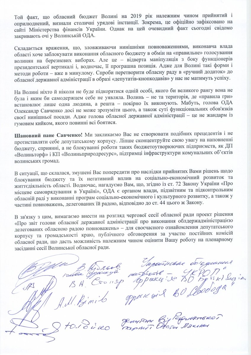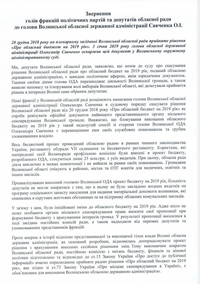 Наші фракції у Волинській обласній раді розцінюють намагання голови Волинської обласної державної адміністрації Олександра Савченка в судовому порядку скасувати рішення Волинської обласної ради від 20 грудня 2018 року «Про обласний бюджет на 2019 рік» як спроби ревізувати офіційні документи найвищого представницького органу місцевого самоврядування Волинської громади. Вважаємо, що блокування виконання обласного бюджету на 2019 рік у такий недолугий спосіб зі сторони голови Волинської ОДА Олександра Савченка є перевищенням ним своїх службових повноважень та грубим зловживанням владою.