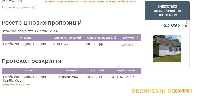 Стартова ціна лоту була 23,093 тисячі гривень. Аукціон відбувся 14 січня. На нерухомість претендував єдиний учасник – Вадим Приймачок, який запропонував 58 тисяч гривень, його й визнали переможцем.Рішення про продаж низки приміщень, які не використовуються у Ківерцівській громаді, було ухвалене у листопаді 2021 року.