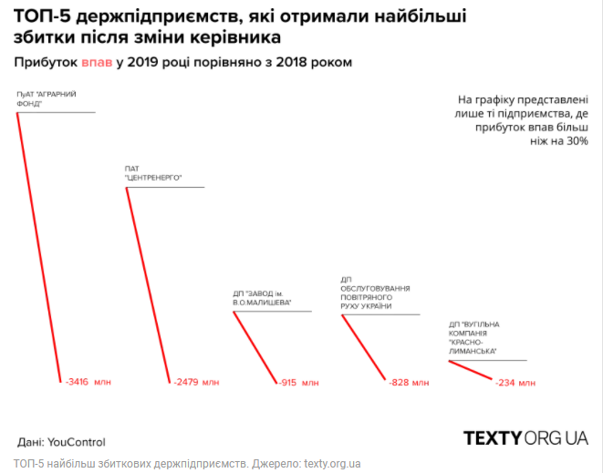 Серед топ-5 компаній, які отримали найбільші збитки в 2019 році в порівнянні з 2018 роком – «Аграрний фонд» (-3,4 млрд грн), Центренерго (-2,479 млрд грн) і ДП «Завод ім. Малишева» (-915 млн грн), а також – ДП «Обслуговування повітряного руху України» (-828 млн грн) та ДП «Вугільна компанія» Краснолиманська «(-234 млн грн).