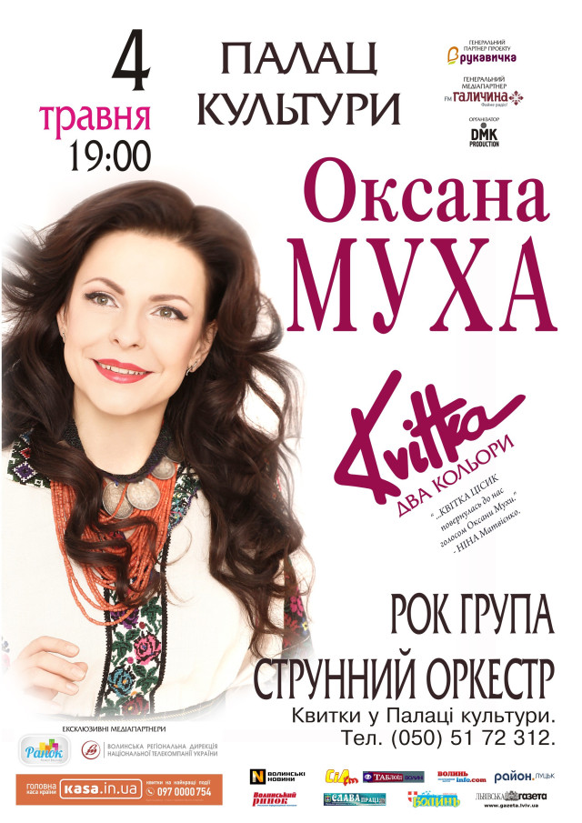 До 65-ліття легендарної співачки Квітки Цісик в рамках концертного туру «KVITKA: ДВА КОЛЬОРИ» містами Західної України у рамках соціально-культурного проекту Оксани Мухи «Дякую тобі, Квітко» відбудеться концерт у Луцьку.