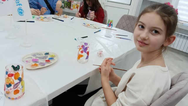 Дев’ять дітей з Луцької громади на занятті розмальовують склянки.