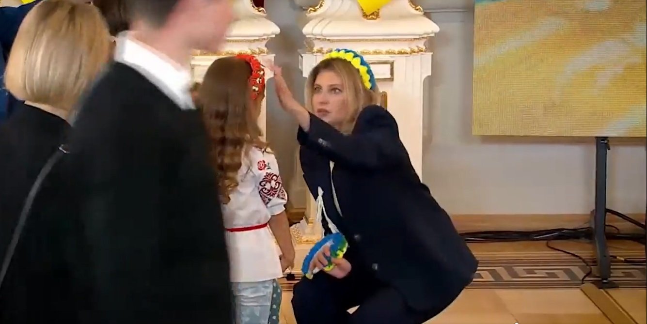 Щоб зібрати кошти на потребу ЗСУ, Іринка власноруч робить віночки. На відео видно, що на захід вона одягнула один зі своїх виробів. А ще на кадрах помітно, що на голові першої леді Олени Зеленської теж з’явився синьо-жовтий віночок, ймовірно, це теж творіння рук дівчинки.