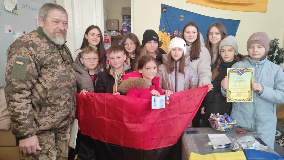 Окрім відзнаки, дітям також вручили подяку та червоно-чорний прапор із підписами й побажаннями військовослужбовців, які нині на фронті.