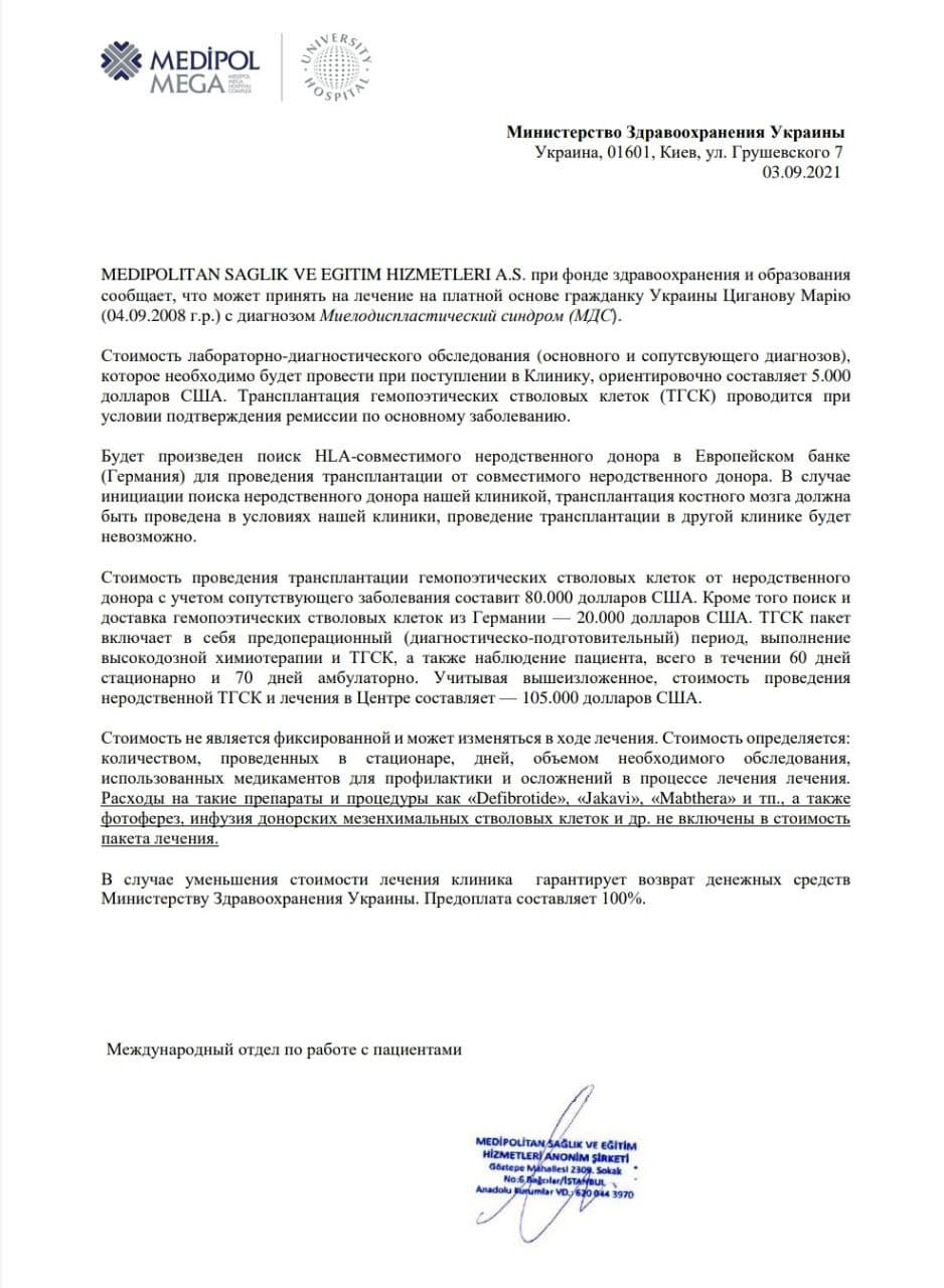 «Нашої з вами допомоги потребує зовсім юна дівчинка з Луцька, якій 4 вересня виповнилося 13 років і на долю якої випало нелегке випробовування.Діагноз: мієлодиспластичний синдром(мдс). Цигановій Маші потрібна трансплантація кісткового мозку. Турецька клініка погодилась провести лікування, загальна сума якого 105-110 тисяч $. Така сума є непідйомна для батьків! Прошу допомоги від свого імені, від імені батьків та знайомих Маші», - інформує волонтерка.Зі слів Роксолани Несторук, станом на ранок 7 вересня 2021 року вдалося зібрати 208 тисяч 080 гривень.