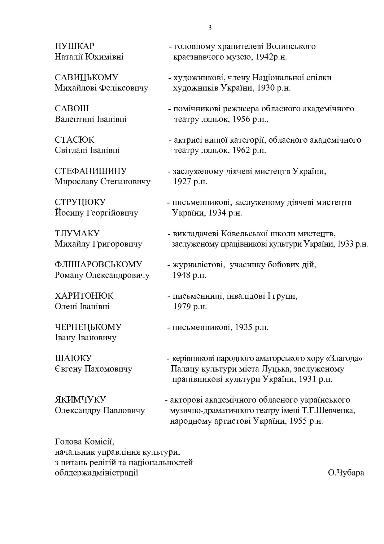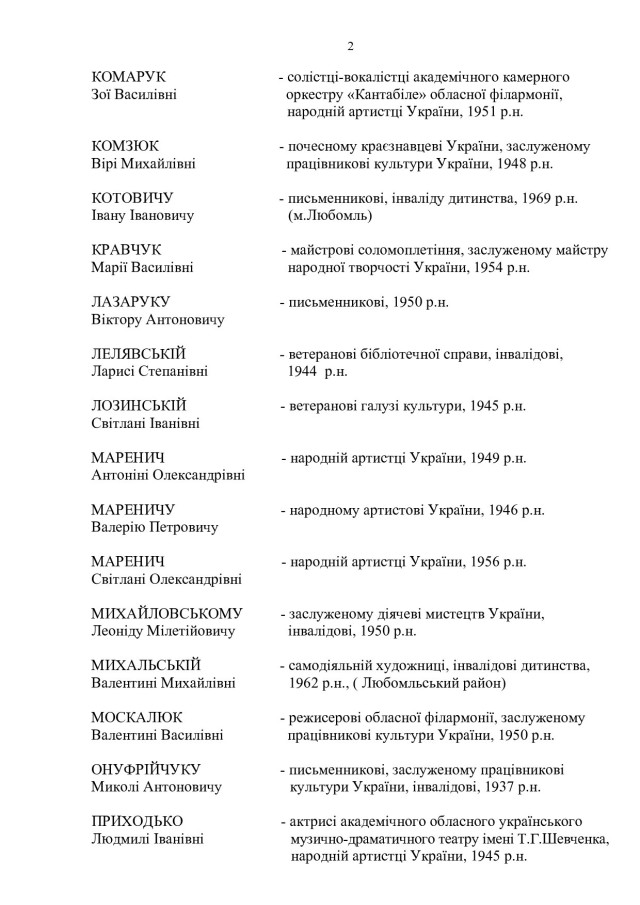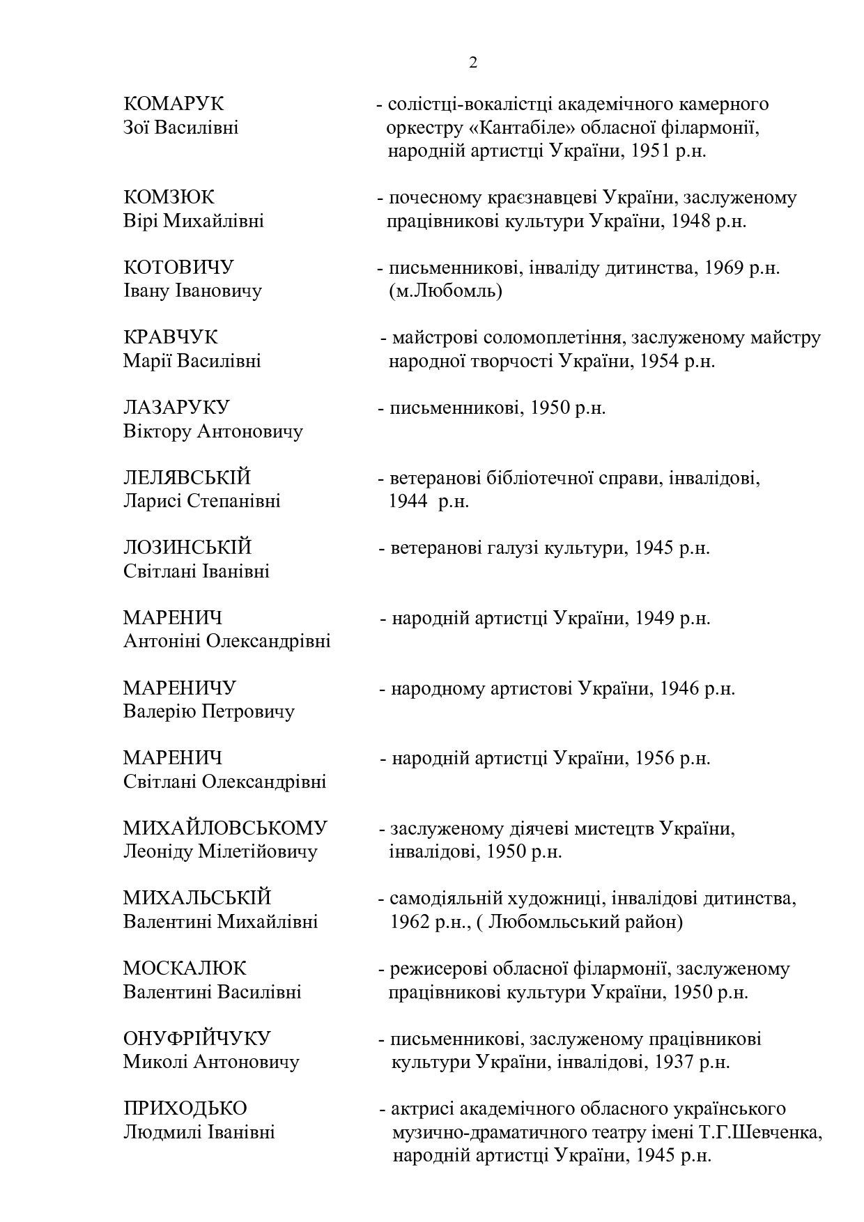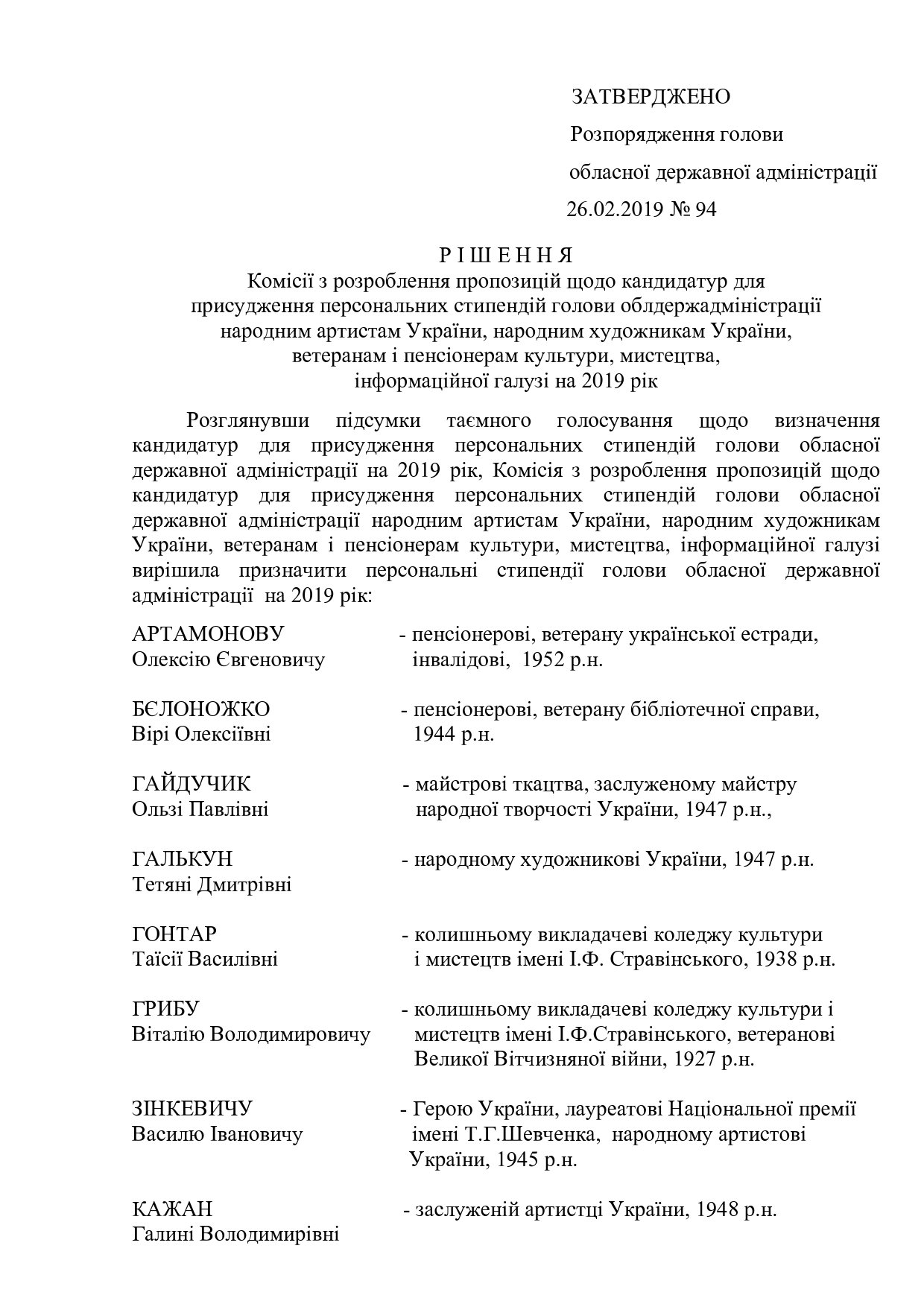 Відповідно до рішення комісії з розроблення пропозицій щодо кандидатур для присудження персональних стипендій голови облдержадміністрації народним артистам України, народним художникам України, ветеранам і пенсіонерам культури, мистецтва, інформаційної галузі на 2019 рік, стипендіатами стали, зокрема, народні артисти України Василь Зінкевич, Зоя Комарук, Антоніна, Світлана та Валерій Мареничі, Людмила Приходько та Олександр Якимчук, письменники Віктор Лазарук, Микола Онуфрійчук, Йосип Струцюк, Іван Котович та Іван Чернецький.