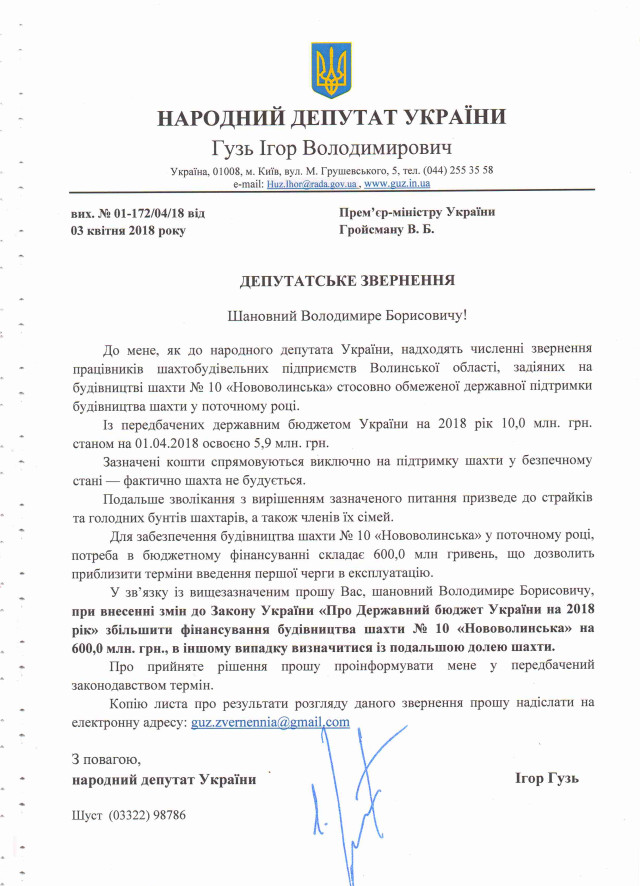 Народний депутат Ігор Гузь звертається до прем’єр-міністра Володимира Гройсмана розглянути можливість збільшення фінансування добудови шахти №10 “Нововолинська”. Це потрібно на реальний розвиток гірничого підприємства для видобутку вугілля, а не лише на підтримку в безпечному стані.