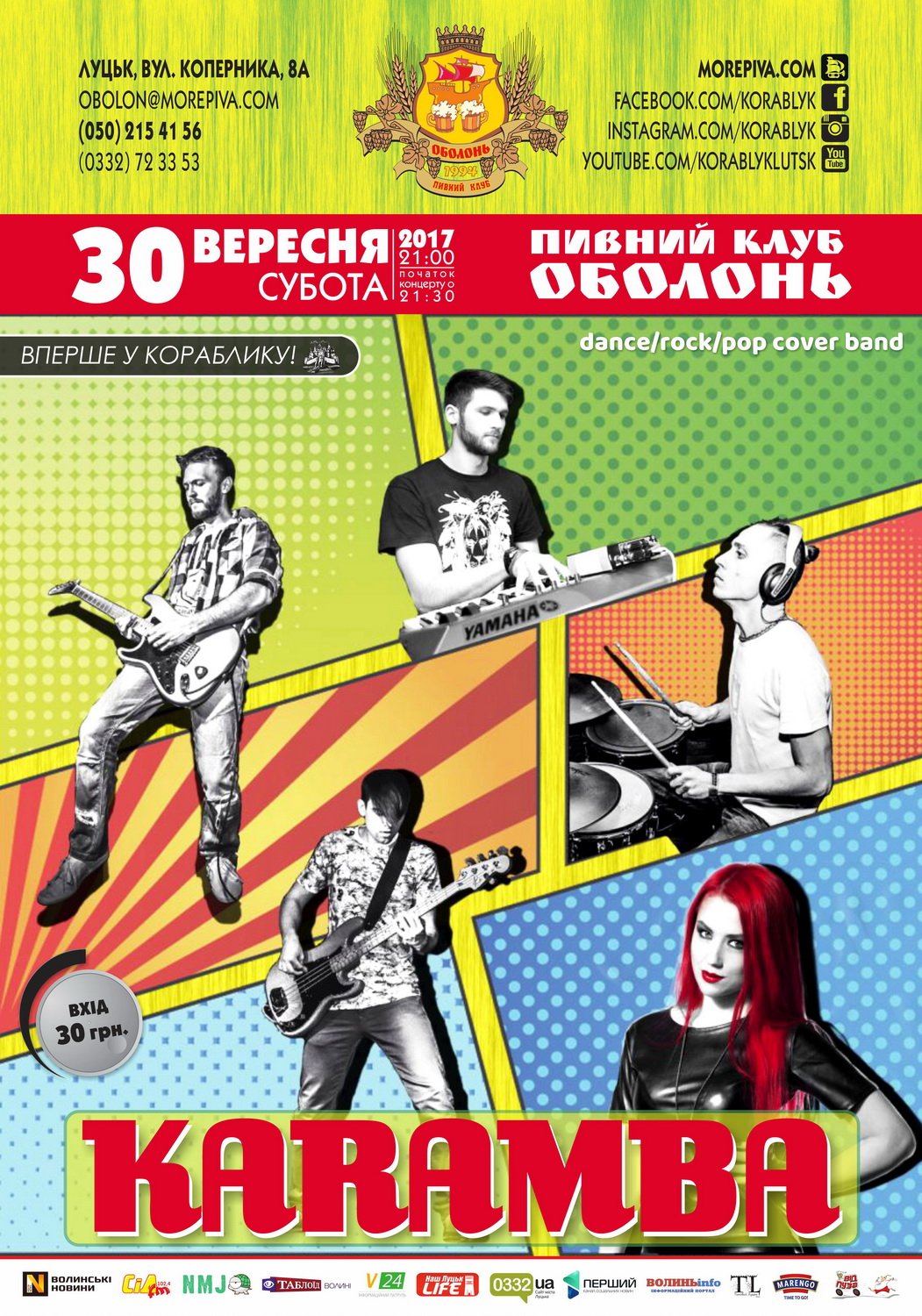Вже у цю суботу в «Кораблику» - прем'єра. Цього разу презентуватимуть увазі лучан новий кавер-гурт «Karamba» з Луцька. Команда не так давно створена, проте її учасники вже давно знайомі лучанам, і не тільки, за іншими проектами. Зокрема, вокалістка «Карамби» Юлія Іванова, яку добре знають за акустичними концертами у «Кораблику» і як учасницю «Х-Фактору».