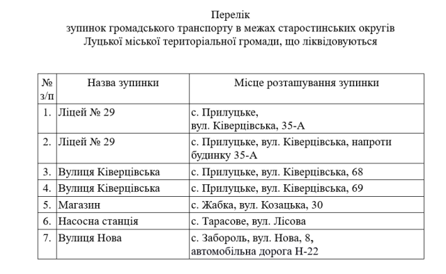Перелік тих, що вирішили скасувати.У підсумку члени виконкому затвердили зупинки громадського транспорту регулярних пасажирських перевезень у межах Прилуцького, Жидичинського, Боголюбського, Княгининівського та Заборольського старостинських округів. Департаменту житлово-комунального господарства доручено обладнати нові і демонтувати ліквідовані.