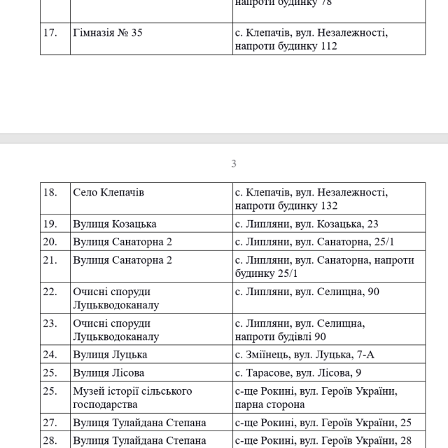 Повний список та адреси зупинок доступні на сайті міської ради у додатках за покликанням (номер додатка відповідає номеру старостинського округу, що вказані нижче, – ВН).