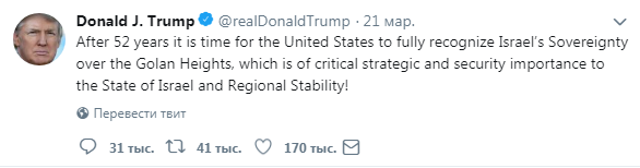 «Через 52 роки Сполученим Штатам пора повністю визнати суверенітет Ізраїлю над Голанськими висотами, що мають важливе стратегічне значення і значення у сфері безпеки для держави Ізраїль і регіональної стабільності!», – написав президент США Дональд Трамп в своєму Twitter 21 березня.Сирія назвала «серйозним порушенням міжнародного права» цю заяву президента Дональда Трампа. Генеральний секретар Ліги арабських держав Ахмед Абу-ль-Гейт зазначив, що слова американського президента зменшили шанси на встановлення справедливого миру в регіоні.