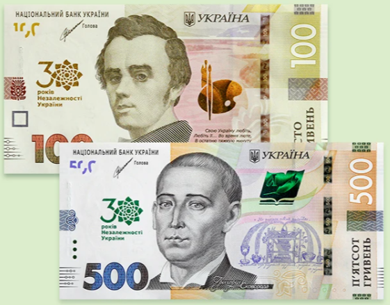 Нацбанк 20 серпня введе в обіг дві пам’ятні банкноти номіналами 100 та 500 гривень, присвячені 30-річчю Незалежності України.