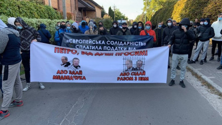Як повідомляє Суспільне, також протестувальники розгорнули плакат із зображенням Порошенка та Віктора Медведчука, на якому закликають здати Медведчука.