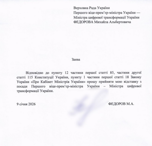 «До Верховної Ради України надійшла заява про відставку Першого віцепрем’єр-міністра України – міністра цифрової трансформації Михайла Альбертовича Федорова», – поінформував він і оприлюднив відповідну заяву.