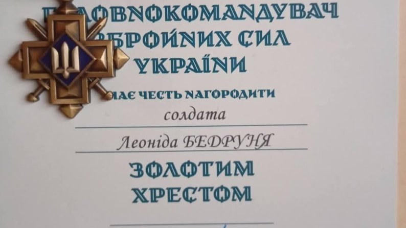 «У травні 2024 року біля населеного пункту Урожайне Донецької області, коли виходив з оточення, отримав поранення. Попри це, пішов витягати з поля бою іншого бійця, який теж був 300. За це, мабуть, і отримав нагороду від Головнокомандувача», – каже Леонід Бедрунь.