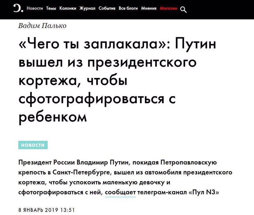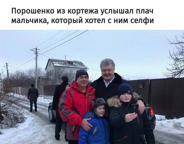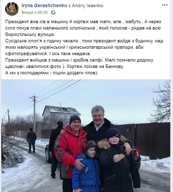 Геращенко зазначила: «Президент уже сів у машину й кортеж мав їхати, але, мабуть, і через скло почув плачі маленького хлопчиська, який голосив – ридав на всю бориспільську вулицю. Сусідське хлоп’я з годину чекало, поки президент вийде з будинку, над яким майорять український і кримськотатарський прапори, аби сфотографуватися. І ось така невдача. Президент вийшов з машини і зробив селфі. Малі помчали додому щасливі – хвалитися фото): Кортеж поїхав на Банкову», – написала вона.У соцмережах одразу пригадали, що подібна селфі-історія в медіапросторі уже була – з Володимиром Путіним, який місяць тому сфотографувався з дівчинкою, яка плакала, і який любить на фото цілувати дітей у животи.Згадали й недавні білборди Порошенка про «реальні справи», які виявилися плагіатом реклами путінської «Єдиної Росії». Тож користувачі Фейсбука припустили, що у політиків один піарник на двох.Історію про селфі хлопчика з Порошенком у соцмережах сприйняли неоднозначно, адже уявити, що Президент почув плач дитини через 6 см броні своєї машини, доволі важко. Тож Порошенка висміяли за піар на дітях та чергову спробу «бути ближчим до народу».Вочевидь Порошенко намагається реабілітуватися за фрази на кшталт «Гражданских – отсечь!» – як він говорив на недавній зустрічі з народом у Білій Церкві.Нагадаємо, раніше Порошенко фотографувався з сільськими дітьми, у яких замість ключок та ковзанів для гри у хокей – були палки та гумові чоботи. Після критики фото Президент усе ж розпорядився купити дітям ключки.
