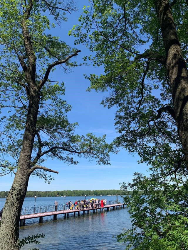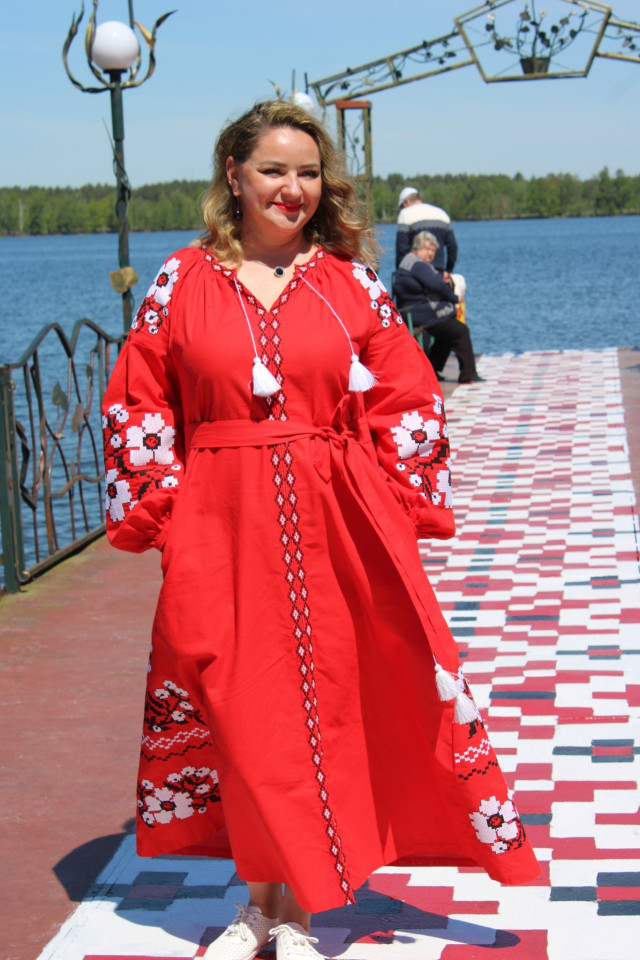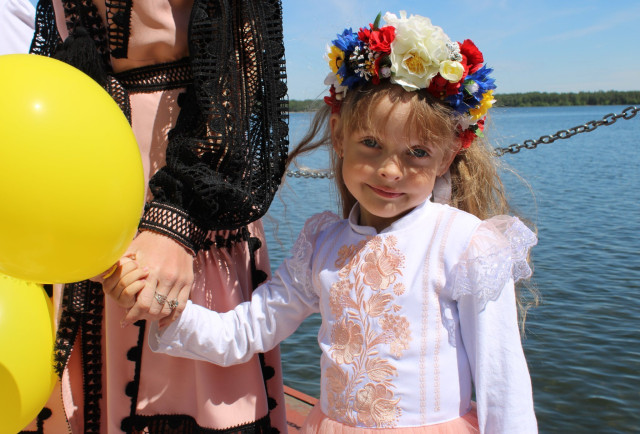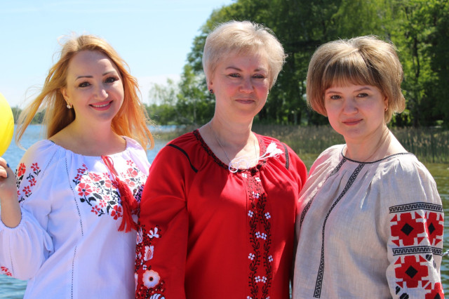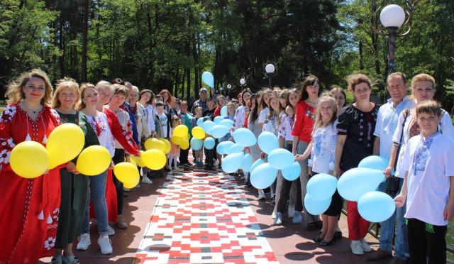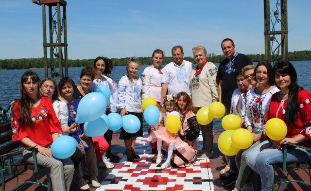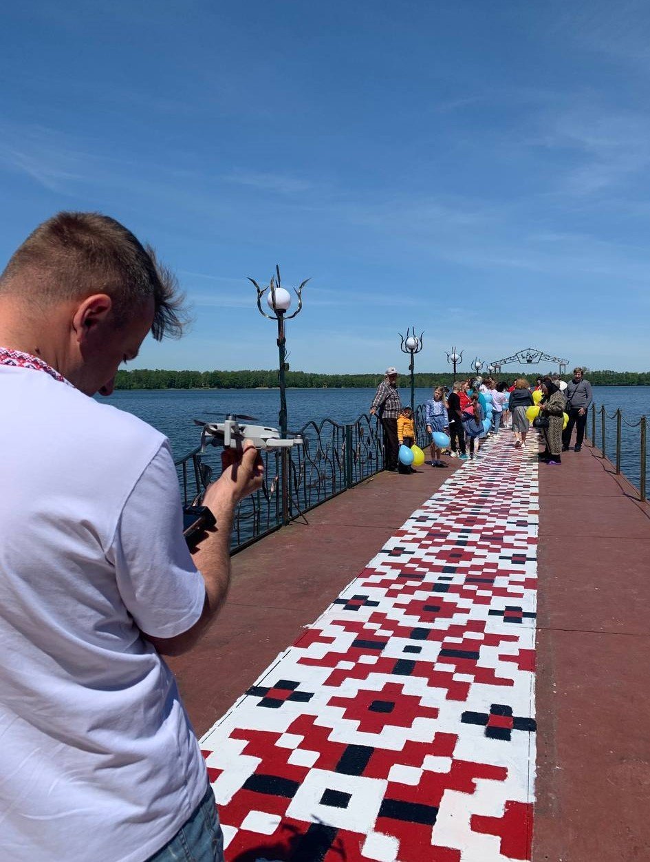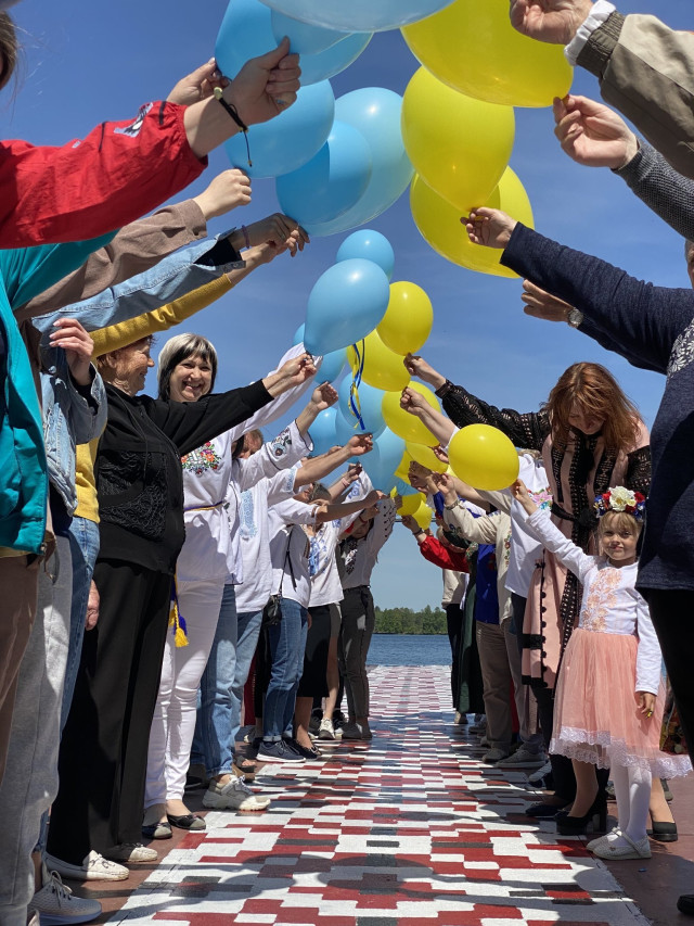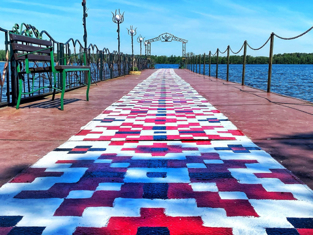 «Вишивана» доріжка у традиційних українських орнаментах і кольорах відтепер прикрашатиме кількадесятметровий пірс, який сполучає берег оздоровниці з озером Пісочне. Цей стилізований рушник майже тиждень творили теперішні мешканці обласного комунального закладу – вимушені переселенці зі сходу, півдня, півночі та центру України.Люди неодмінно хотіли приєднатися до традиційного вишиваного флешмобу, але у звичний спосіб, одягнувши вишиванку, зробити це могли не всі. Адже більшість поспіхом полишали домівки під обстрілами, або ж і взагалі залишилися без нічого.«Для тих, хто, попри все, хотів бути у вишиванці, ми домовилися про суттєву знижку у місцевому магазині. Треба було лише сказати пароль: «Доброго вечора! Ми – з «Лісової пісні», – розповіла директорка оздоровниці Руслана Дибель. І цією нагодою переселенці скористалися, хоча, зрозуміло, не масово.Так і народилася ідея «вбрати» у вишиванку озерний міст, додає авторка ініціативи Ірина Сироватка. Вона евакуювалася з Київщини, оселившись у санаторії «Лісова пісня», через кілька днів тут же тимчасово працевлаштувалася. Жінка і координувала втілення своєї ідеї.
