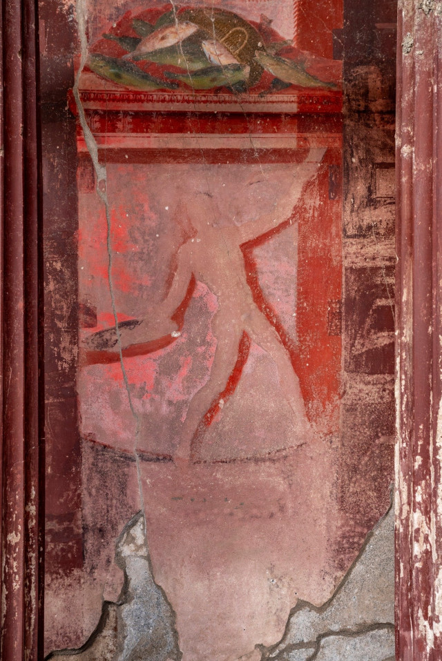 Під фресками із вакханками та сатирами знайшли зображення живих і мертвих тварин, зокрема оленя, нещодавно випатраного кабана, птахів, а також риб і молюсків.