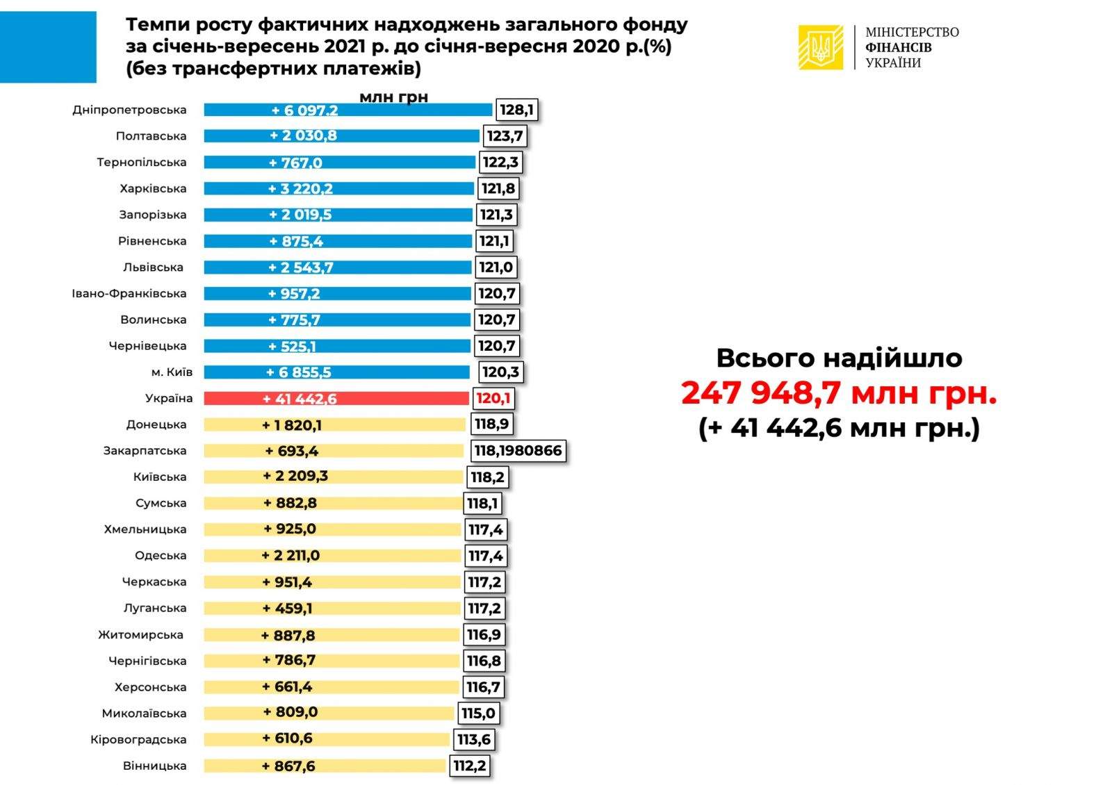 За 9 місяців 2021 року до загального фонду місцевих бюджетів надійшло 247 мільярдів 948 мільйонів 700 тисяч гривень. У порівнянні з таким же періодом 2020 року – це на 20,1% (41 мільярд 442 мільйони 600 тисяч гривень) більше.