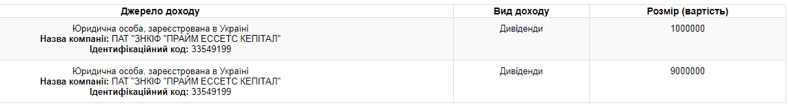Так 14 грудня Петро Порошенко задекларував 1 млн і 9 млн гривень дивідендів від Прайм Ессетс Кепітал.