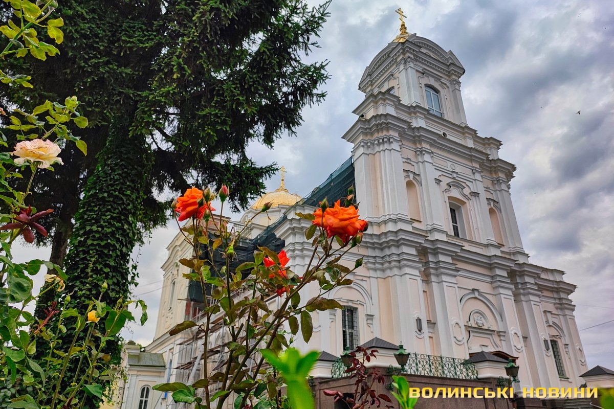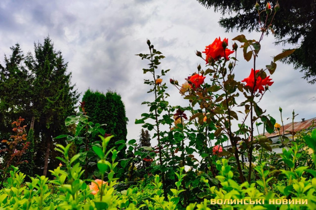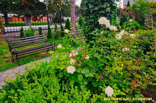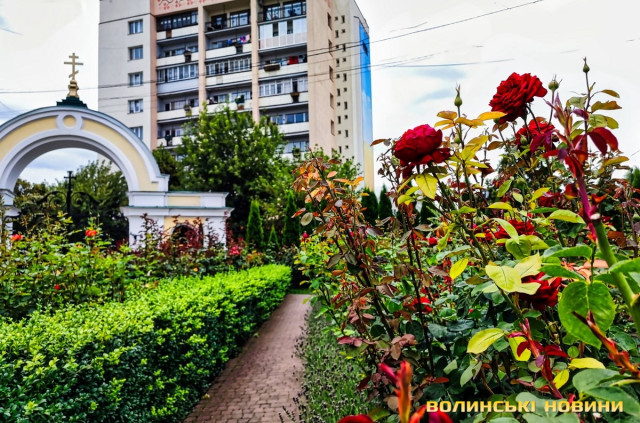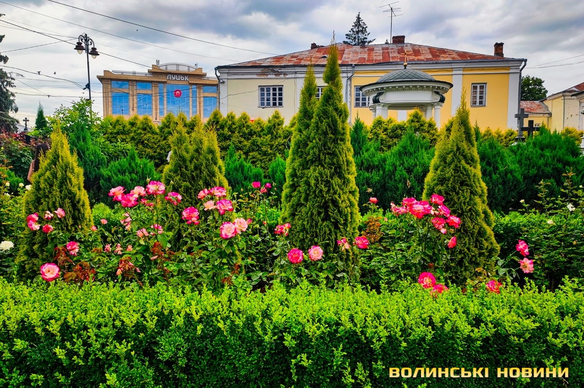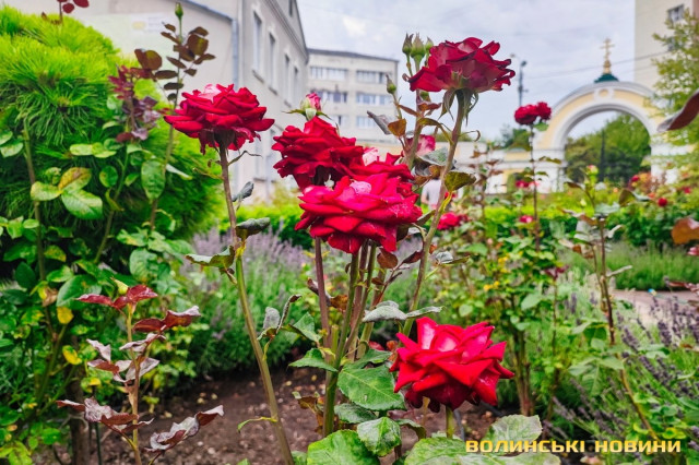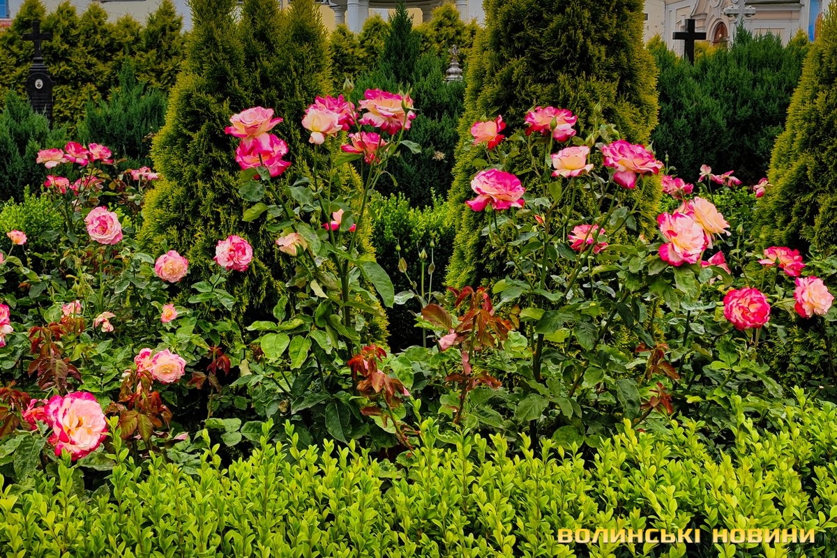 Двір кафедрального собору Святої Трійці прикрашають квітучі троянди різних кольорів. Імпровізований розарій став справжньою прикрасою центральної частини Луцька та місцем релаксу. Частина квітів була привезена з Маріуполя, який нині під окупацією.