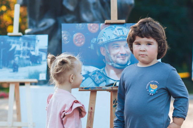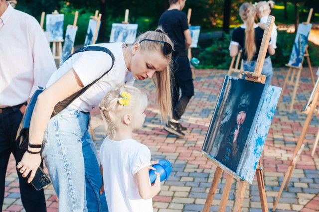 Вікторія з маленькою донечкою Емілією побачили на фотовиставці свого чоловіка й татка. Дитя довго вдивлялося в світлину рідної і дорогої людини, яка зараз так далеко від неї…