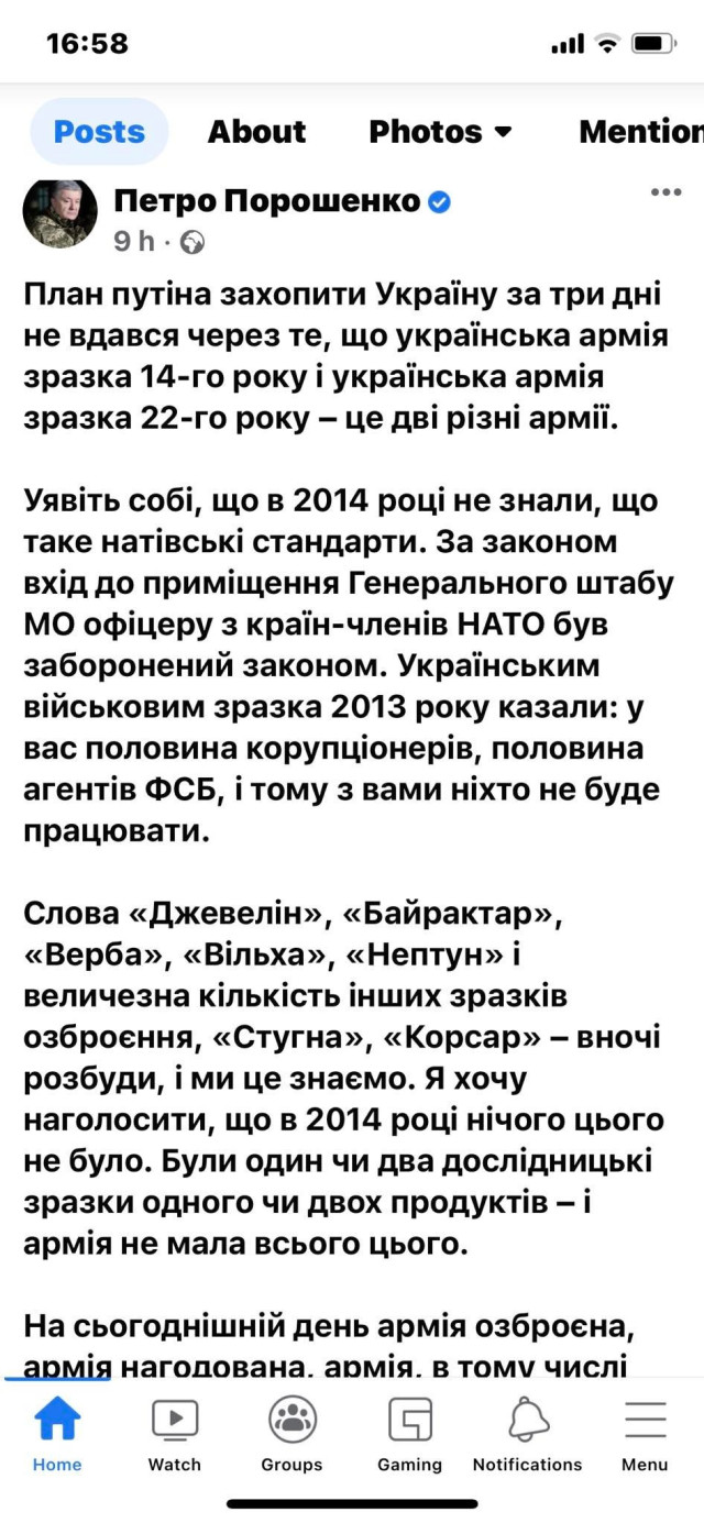П’ятий президент України Петро Порошенко, за каденції якого Росія розпочала війну з Україною, нахабно присвоює собі здобутки попередників та продовжує будувати піар на брехні у найважчий для держави час.