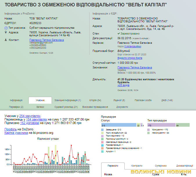 Компанія «Вельт Капітал» зареєстрована у 2016 році. У перший рік фірма отримала замовлень на майже 10,5 мільйона гривень. А ось у 2018 сума виграних торгів перевалила за півмільярда. Загалом за 4 роки діяльності, ТОВ «Вельт Капітал», згідно з даними https://clarity-project.info/, стало переможцем у 154 тендерах на загальну суму майже 1,3 мільярда гривень.